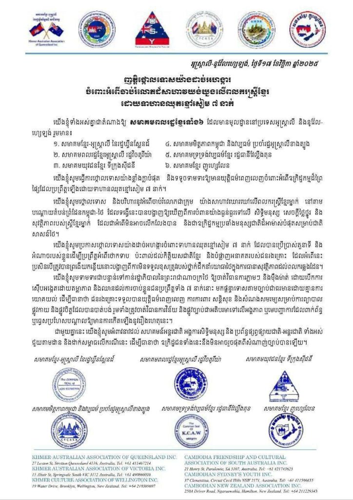 សមាគមពលរដ្ឋខ្មែរទាំង៦ ដែលមានមូលដ្ឋាននៅប្រទេសអូស្ត្រាលី និងនូវែល- ហ្សេឡង់ ថ្កោលទោសយ៉ាងដាច់អហង្ការចំពោះអំពើរំលោភដ៏សាហាវយង់ឃ្នងលើពលករស្ត្រីខ្មែរ ដោយទាហានឈុតខ្មៅសៀម