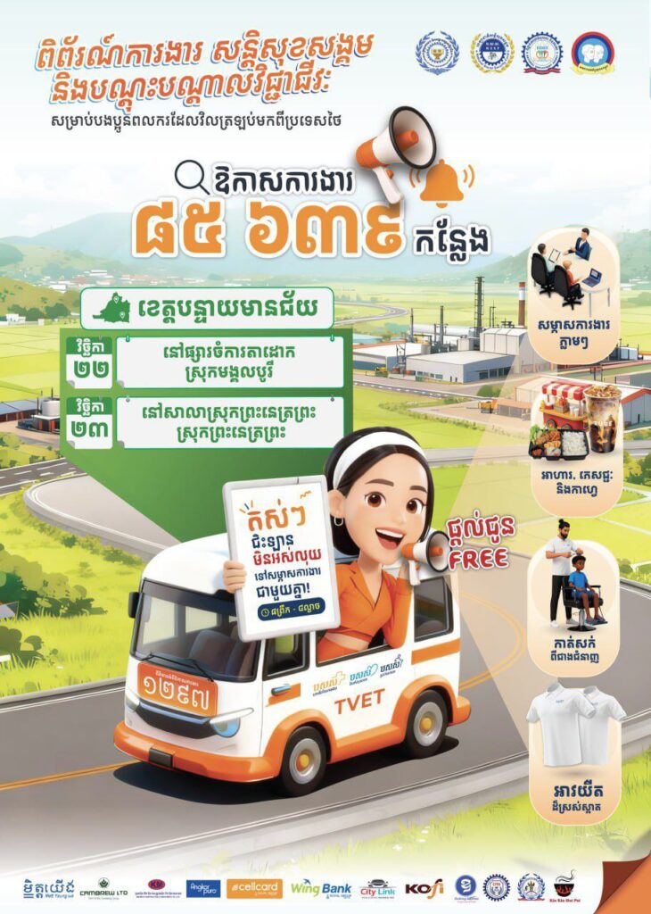 (ភ្នំពេញ)៖ ក្រសួងការងារ និងបណ្ដុះបណ្ដាលវិជ្ជាជីវៈ នឹងបន្តរៀបចំពិព័រណ៍ការងារ សន្តិសុខសង្គម និង បណ្តុះបណ្តាលវិជ្ជាជីវៈ ដោយនាំយកឱកាសការងារ រាប់ម៉ឺនកន្លែងសម្រាប់បងប្អូនអតីតពលករដែលត្រឡប់មកពីថៃ យុវជន និងអ្នកស្វែងរកការងារ នៅខេត្តបន្ទាយមានជ័យ រយៈពេល២ថ្ងៃនាចុងសប្តាហ៍នេះ នៅថ្ងៃទី២២ និងទី ២៣ ខែវិច្ឆិកា ឆ្នាំ២០២៥។