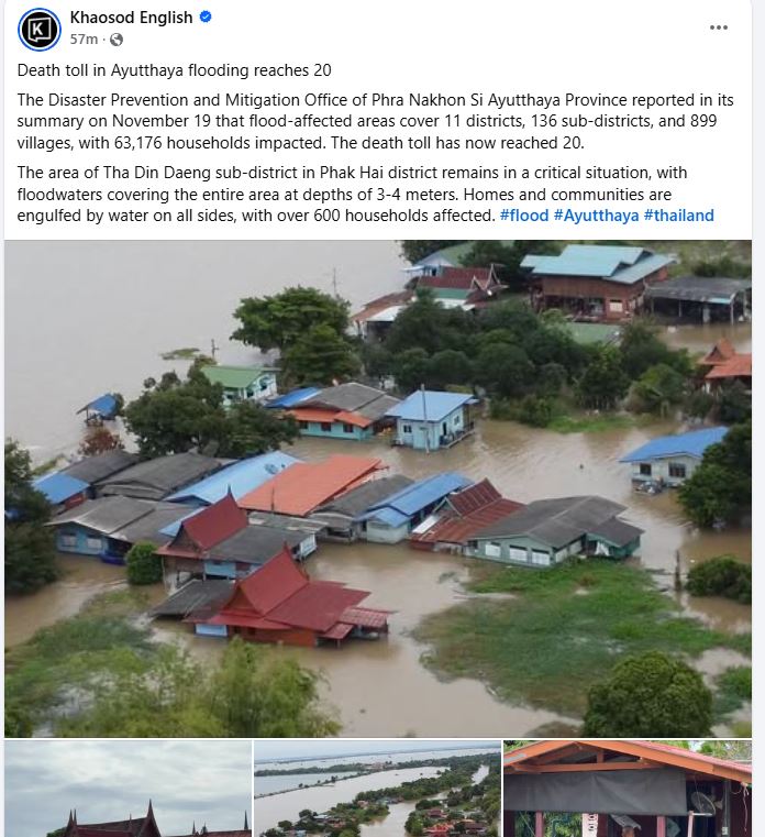 យោងតាមសារព័ត៌មានថៃ ខៅសុត, ការិយាល័យបង្ការ និងកាត់បន្ថយគ្រោះមហន្តរាយខេត្ត បានរាយការណ៍ នៅក្នុងសេចក្តីសង្ខេបរបស់ខ្លួន នៅថ្ងៃទី១៩ ខែវិច្ឆិកា នេះ ថា តំបន់ដែលរងផលប៉ះពាល់ ដោយសារទឹកជំនន់ បានគ្របដណ្តប់តាមបណ្តាស្រុក ភូមិ ជាច្រើនកន្លែង ប៉ះពាល់ដល់ប្រជាជន ចំនួន ៦ម៉ឺនបីពាន់ ១៧៦គ្រួសារ។ ប្រភពបញ្ជាក់ថា ចំនួនអ្នកស្លាប់ បានកើនបានដល់ ២០នាក់ហើយ។