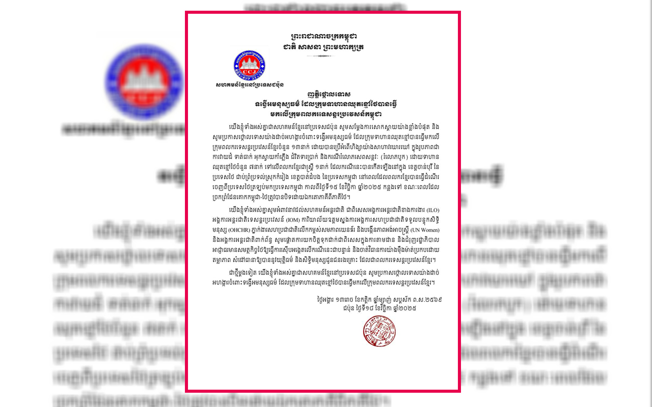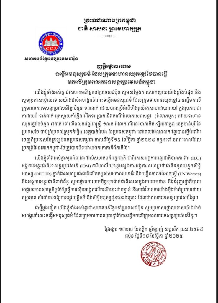 (ភ្នំពេញ)៖ សហគមន៍ខ្មែរនៅប្រទេសជប៉ុន ទាំង អស់ នៅថ្ងៃទី១៩ ខែវិច្ឆិកា ឆ្នាំ២០២៥នេះ បាន ចេញញត្តិប្រកាសថ្កោលទោសយ៉ាងដាច់អហង្ការចំពោះទង្វើអមនុស្សធម៌ ព្រៃផ្សៃយង់ឃ្នង របស់ ក្រុម ទាហានឈុតខ្មៅថៃដែលបានធ្វើមកលើ ក្រុមពលករទេសន្តរប្រវេសន៍ខ្មែរចំនួន ១៣នាក់ និងអំពើថោកទាបជាករណីរំលោភសេពសន្ថវៈយ៉ាងព្រៃផ្សៃ។
