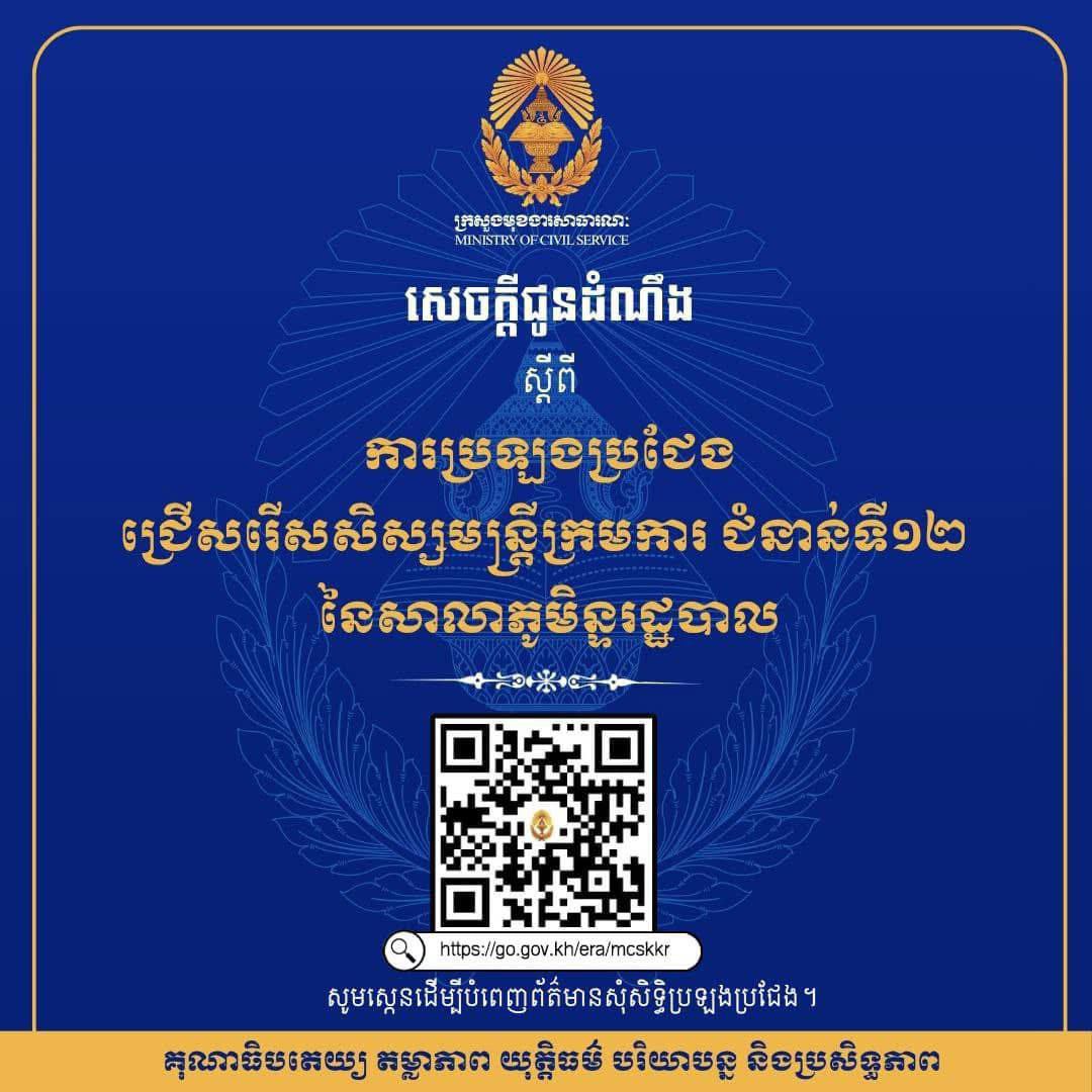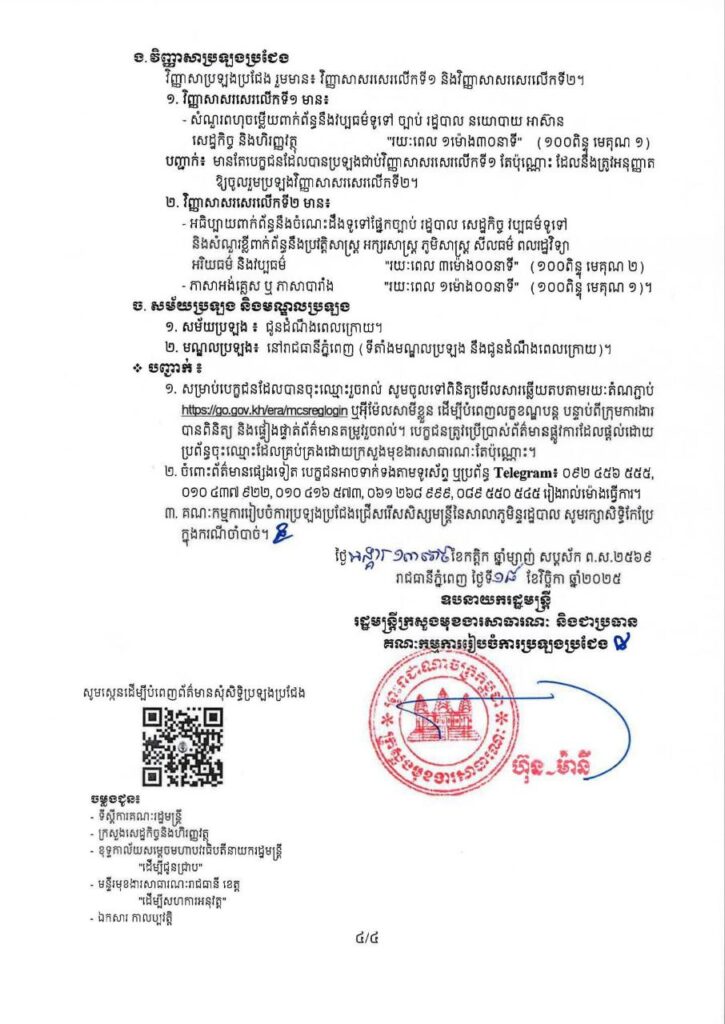 សាធារណជន អាចបំពេញព័ត៌មាន សុំសិទ្ធិប្រឡងប្រជែង ចាប់ពីថ្ងៃទី១៨ ខែវិច្ឆិកា ឆ្នាំ២០២៥ រហូតដល់ថ្ងៃទី១៧ ខែធ្នូ ឆ្នាំ២០២៥ វេលាម៉ោង ១៧:០០នាទី ជាកំហិត តាមរយៈ QR Code ឬ https://go.gov.kh/era/mcskkr