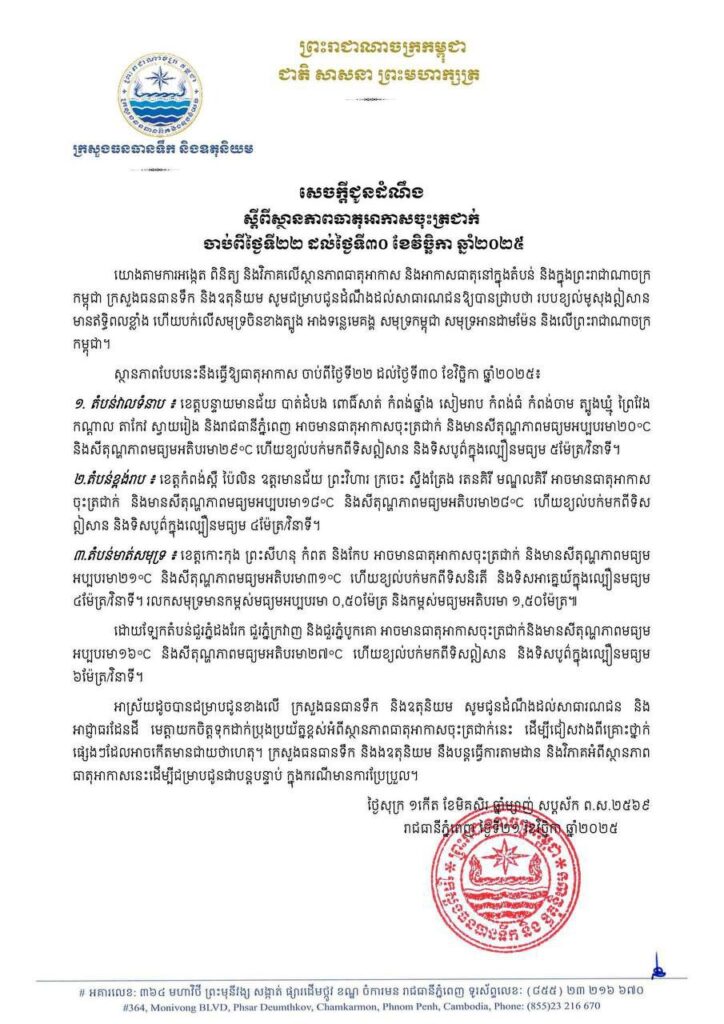 ក្នុងសេចក្តីជូនដំណឹងរបស់ក្រសួងធនធានទឹក និងឧតុនិយមបានប្រាប់ឱ្យដឹងពីស្ថានភាពធាតុអាកាសចុះត្រជាក់ ចាប់ពីថ្ងៃទី២២ ដល់ថ្ងៃទី៣០ ខែវិច្ឆិកា ឆ្នាំ២០២៥ ។របបខ្យល់មូសុងឦសាន មានឥទ្ធិពលខ្លាំង ហើយបក់លើ សមុទ្រចិនខាងត្បូង អាងទន្លេមេគង្គ សមុទ្រកម្ពុជា សមុទ្រអានដាមម៉ែន និងលើព្រះរាជាណាចក្រ កម្ពុជា។ ស្ថានភាពបែបនេះ នឹងធ្វើឱ្យធាតុអាកាស ចាប់ពីថ្ងៃទី២២ ដល់ថ្ងៃទី៣០ ខែវិច្ឆិកា ឆ្នាំ២០២៥ នៅតំបន់វាលទំនាប អាចមានធាតុអាកាសចុះត្រជាក់ និងមានសីតុណ្ហភាពមធ្យមអប្បបរមា ២០អង្សាសេ និងសីតុណ្ហភាពមធ្យមអតិបរមា ២៩អង្សាសេ ហើយខ្យល់បក់មកពីទិសឦសាន និងទិសបូព៌ក្នុងល្បឿនមធ្យម ៥ម៉ែត្រ/វិនាទី។