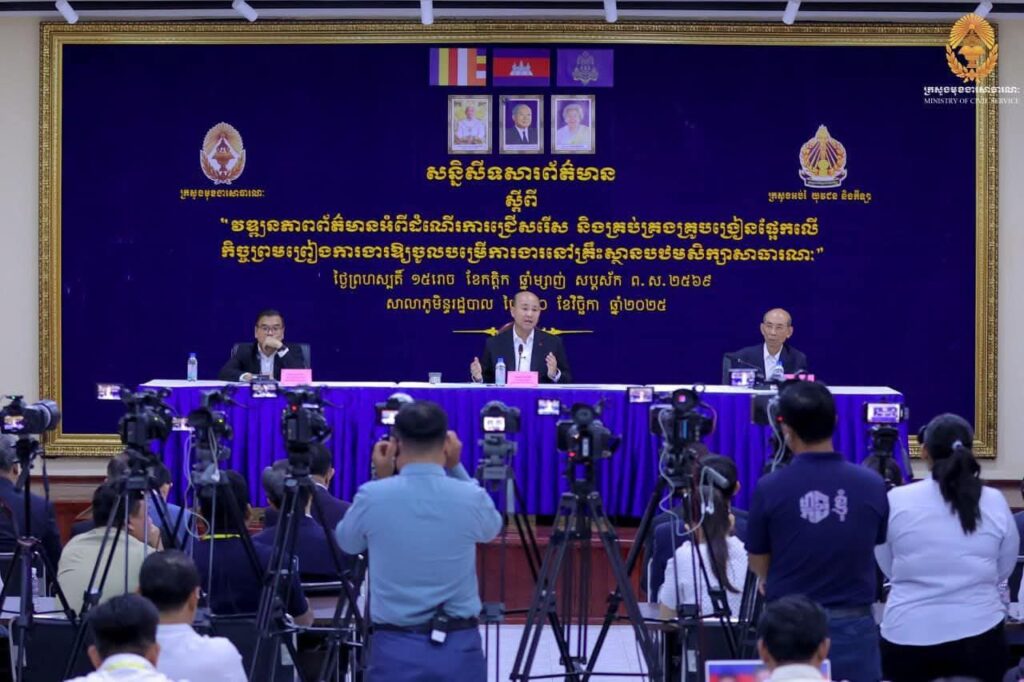 ប្រសាសន៍ ឯកឧត្តមបណ្ឌិតសភាចារ្យ ណាត ប៊ុនរឿន រដ្ឋលេខាធិការក្រសួងអប់រំ យុវជន និងកីឡា ក្នុងសន្និសីទសារព័ត៌មាន ស្ដីពី «វឌ្ឍនភាពព័ត៌មានអំពីដំណើរការជ្រើសរើស និងគ្រប់គ្រងគ្រូង្រៀនផ្អែកលើកិច្ចព្រមព្រៀងការងារឱ្យចូលបម្រើការងារនៅគ្រឹះស្ថានបឋមសិក្សាសាធារណៈ» ក្រោមអធិបតីភាព ឯកឧត្តម ហ៊ុន ម៉ានី ឧបនាយករដ្ឋមន្រ្តី រដ្ឋមន្រ្តីក្រសួងមុខងារសាធារណៈ និងជាប្រធានគណៈកម្មការរៀបចំការប្រឡងប្រជែង នាថ្ងៃទី២០ ខែវិច្ឆិកា ឆ្នាំ២០២៥។