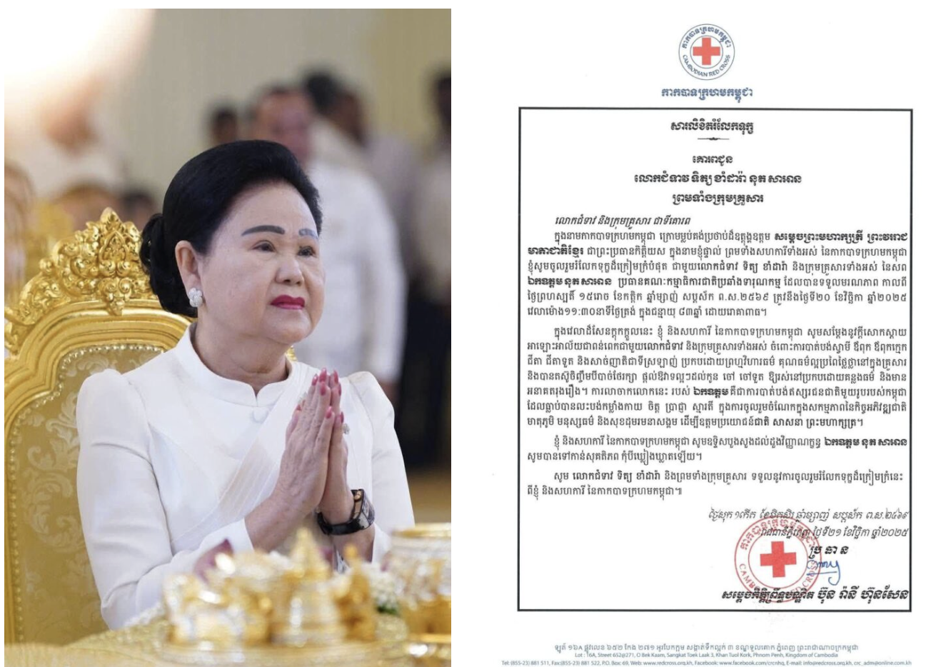 (ភ្នំពេញ)៖ សម្តេចកិត្តិព្រឹទ្ធបណ្ឌិត ប៊ុន រ៉ានី ហ៊ុនសែន ប្រធានកាក បាទក្រហមកម្ពុជា នៅថ្ងៃទី២១ ខែវិច្ឆិកា ឆ្នាំ២០២៥ បានចាត់ប្រតិភូកាកបាទក្រហមកម្ពុជា ដឹកនាំដោយ លោកជំទាវ ពុំ ចន្ទីនី អគ្គលេខាធិការ កាកបាទក្រហ មកម្ពុជា និងសហការី អញ្ជើញគោរពវិញ្ញាណក្ខន្ធ ឯកឧត្តម នុត សាអាន ប្រធានគណៈកម្មាធិការជាតិប្រឆាំងទារុណកម្ម ដែលបានទទួលមរណភាព កាលពីថ្ងៃព្រហស្បតិ៍ ១៥រោច ខែកត្តិក ឆ្នាំម្សាញ់ សប្តស័ក ព.ស.២៥៦៩ ត្រូវនឹងថ្ងៃទី២០ ខែវិច្ឆិកា ឆ្នាំ២០២៥ វេលាម៉ោង ១១:៣០នាទីថ្ងៃត្រង់ ក្នុងជន្មាយុ ៨៣ឆ្នាំ ដោយរោគាពាធ។