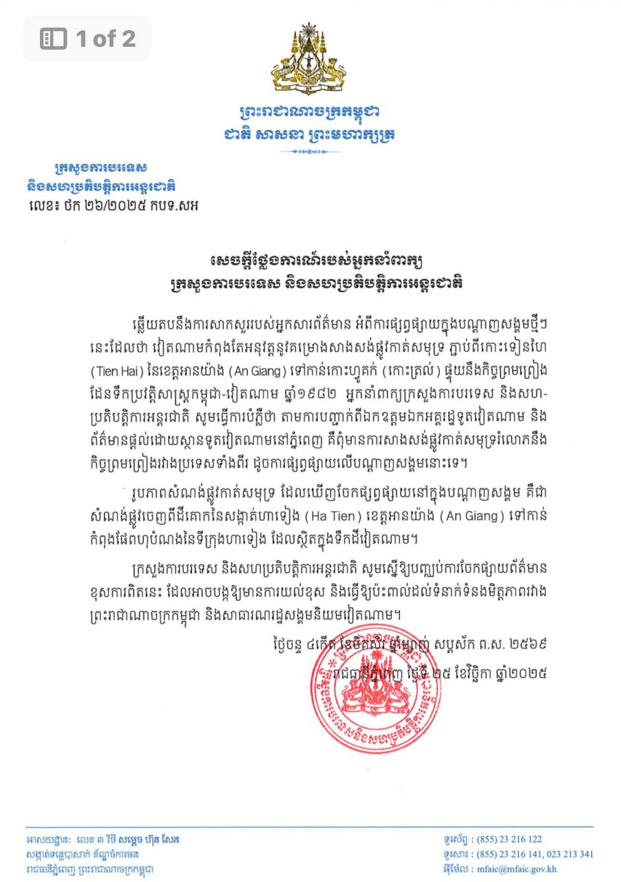 ភ្នំពេញ៖នៅរសៀលថ្ងៃទី២៤ ខែវិច្ឆិកា ឆ្នាំ២០២៥ក្រសួងការបរទេសនិងសហប្រតិបត្តិការអន្តរជាតិបានធ្វើការបំភ្លឺថាពុំមានការសាងសង់ផ្លូវកាត់សមុទ្ររំលោភនឹងកិច្ចព្រមព្រៀងរវាងប្រទេសទាំងពីរ ដោយវៀតណាមដូចការផ្សព្វផ្សាយលើបណ្តាញសង្គមនោះទេ។ចំណែករូបភាពសំណង់ផ្លូវកាត់សមុទ្រ ដែលឃើញចែកផ្សព្វផ្សាយនៅក្នុងបណ្តាញសង្គម គឺជាសំណង់ផ្លូវចេញពីដីគោកនៃសង្កាត់ហាទៀង (Ha Tien) ខេត្តអានយ៉ាង (An Giang) ទៅកាន់កំពង់ផែពហុបំណងនៃទីក្រុងហាទៀង ដែលស្ថិតក្នុងទឹកដីវៀតណាម។