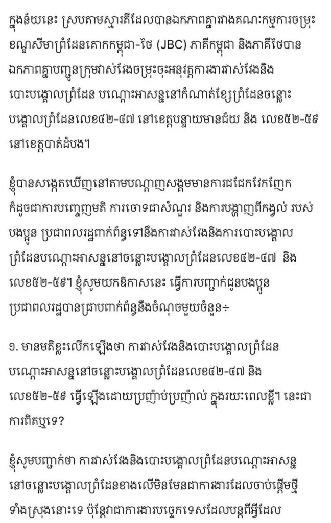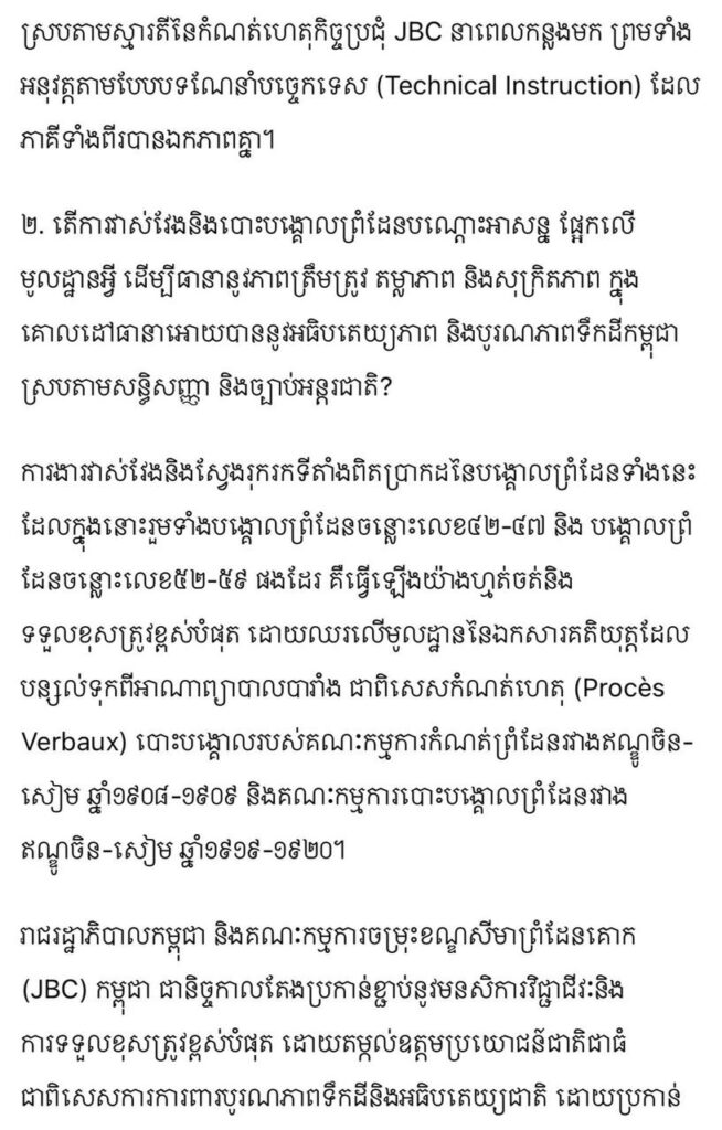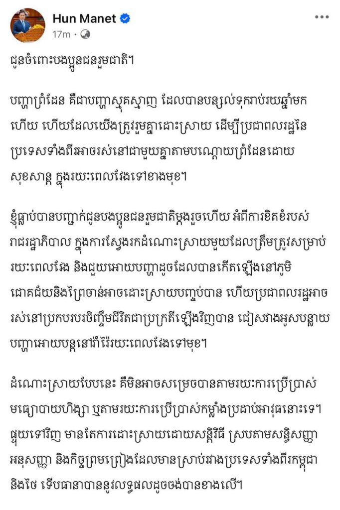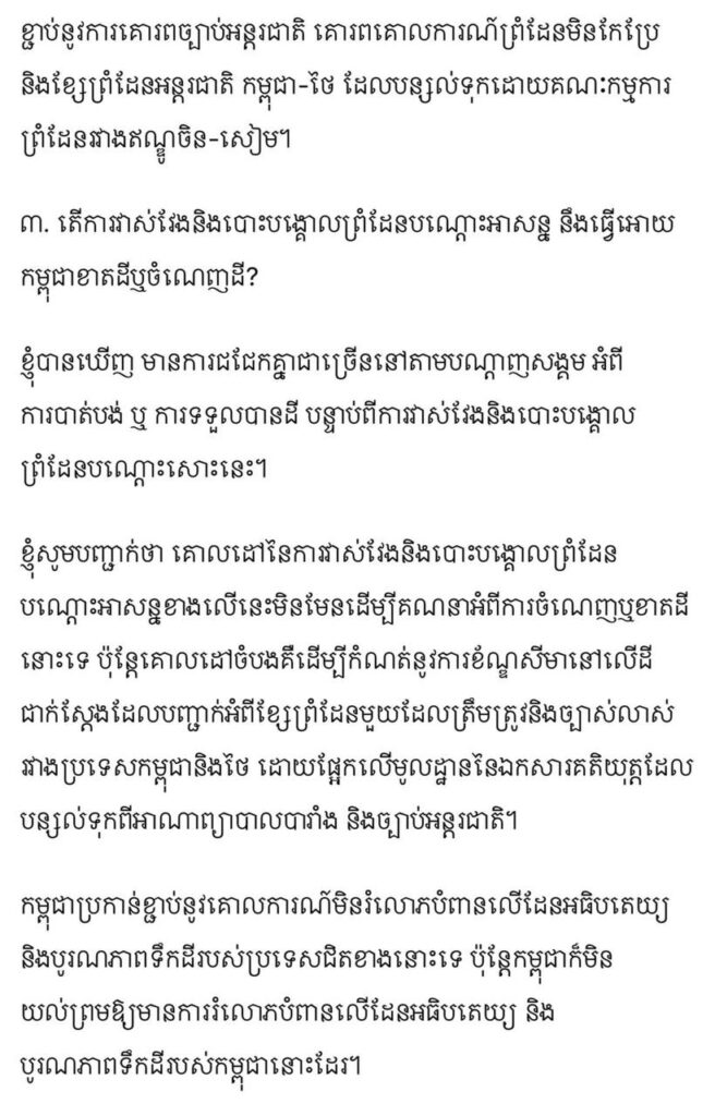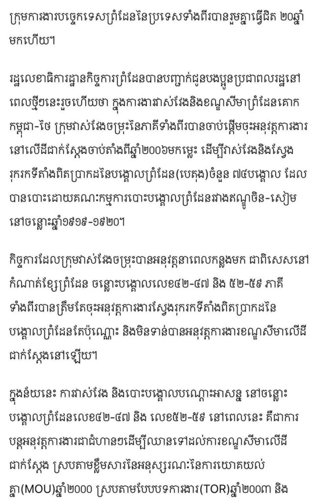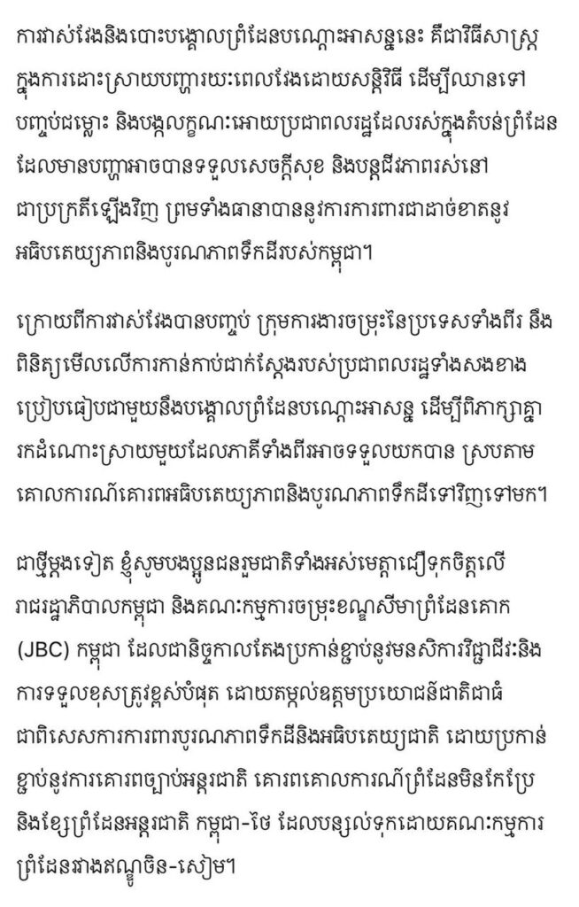ជាថ្មីម្តងទៀត សម្ដេចនាយករដ្ឋមន្ត្រី សូមបងប្អូនជនរួមជាតិទាំងអស់ មេត្តាជឿទុកចិត្តលើរាជរដ្ឋាភិបាលកម្ពុជា និងគណៈកម្មការចម្រុះខណ្ឌសីមា ព្រំដែនគោក (JBC) កម្ពុជា ដែលជានិច្ចកាលតែងប្រកាន់ខ្ជាប់នូវមនសិការវិជ្ជាជីវៈ និងការទទួលខុសត្រូវខ្ពស់បំផុត ដោយតម្កល់ឧត្តមប្រយោជន៍ជាតិជាធំ ជាពិសេស ការការពារបូរណភាពទឹកដី និងអធិបតេយ្យជាតិ ដោយប្រកាន់ខ្ជាប់ នូវការគោរពច្បាប់អន្តរជាតិ គោរពគោលការណ៍ព្រំដែនមិនកែប្រែ និងខ្សែព្រំដែនអន្តរជាតិ កម្ពុជា-ថៃ ដែលបន្សល់ទុកដោយគណៈកម្មការព្រំដែន រវាងឥណ្ឌូចិន-សៀម ៕ ដោយ វណ្ណលុក