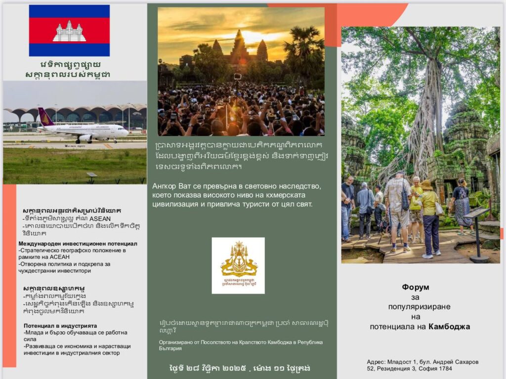 ឯកអគ្គរាជទូតកម្ពុជាប្រចាំប្រទេសប៊ុលហ្គារី ឯកឧត្តមបណ្ឌិត ជា ច័ន្ទបរិបូរណ៌ បានបញ្ជាក់ថា វេទិកាដែលនឹងរៀបចំនៅថ្ងៃទី២៨ ខែវិច្ឆិកាខាងមុខ។វេទិកានេះមានគោលបំណងដើម្បីទាក់ទាញការចូលរួមពីតំណាងសាធារណៈឯកជន អ្នកជំនាញសេដ្ឋកិច្ច និងតំណាងអង្គការអន្តរជាតិផងដែរ ។កម្មវិធីនេះ ក៏នឹងទាក់ទាញឱ្យមានការចូលរួមពីអង្គភាពសារព័ត៌មានចំនួន ១៣អង្គភាព រួមទាំងទូរទស្សន៍ វិទ្យុ និងសារព័ត៌មានឌីជីថល ដែលនឹងមកគាំទ្រការផ្សព្វផ្សាយព័ត៌មានអំពីសក្តានុពលប្រទេសកម្ពុជា ទៅបណ្ដាប្រទេសអឺរ៉ុបទាំងមូល។