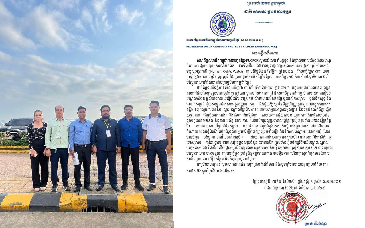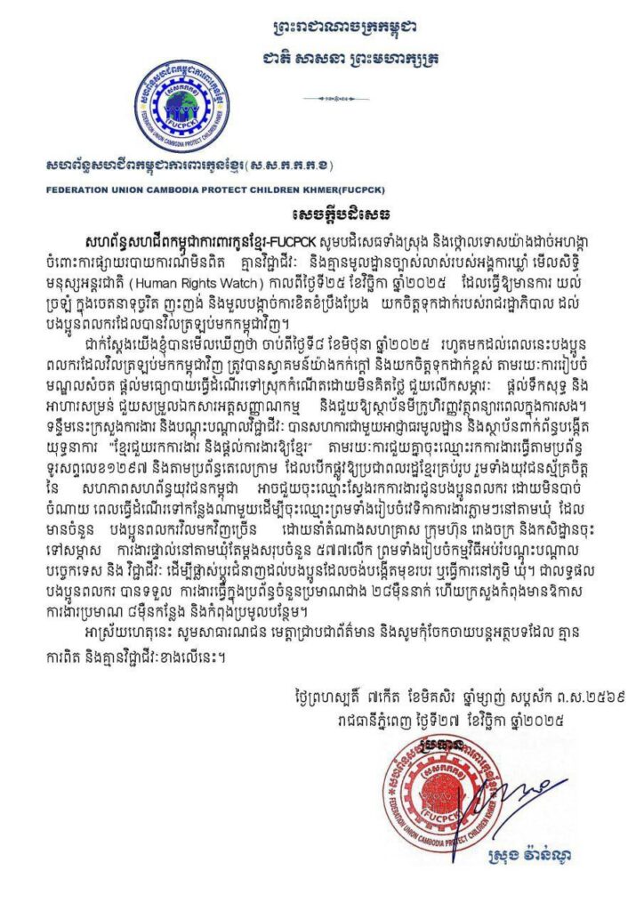 (ភ្នំពេញ)៖ លោក ស្រុង វ៉ាន់ណូ ប្រធានសហព័ន្ធសហជីពកម្ពុជាការពារកូនខ្មែរ (FUCPCK) ព្រមទាំងសមាជិក សមាជិកា សូមបដិសេធទាំងស្រុង និងថ្កោលទោសយ៉ាងដាច់អហង្ការ ចំពោះការផ្សាយរបាយការណ៍មិនពិត គ្មានវិជ្ជាជីវៈ និងគ្មានមូលដ្ឋានច្បាស់លាស់របស់អង្គការឃ្លាំមើលសិទ្ធិមនុស្សអន្តរជាតិ (Human Rights Watch) កាលពីថ្ងៃទី២៥ ខែវិច្ឆិកា ឆ្នាំ២០២៥ ដែលធ្វើឱ្យមាន ការយល់ច្រឡំ ក្នុងចេតនាទុច្ចរិត ញុះញង់ និងមួលបង្កាច់ការខិតខំប្រឹងប្រែង យកចិត្តទុកដាក់របស់រាជរដ្ឋាភិបាល ដល់បងប្អូនពលករ ដែលបានវិលត្រឡប់មកកម្ពុជាវិញ ។