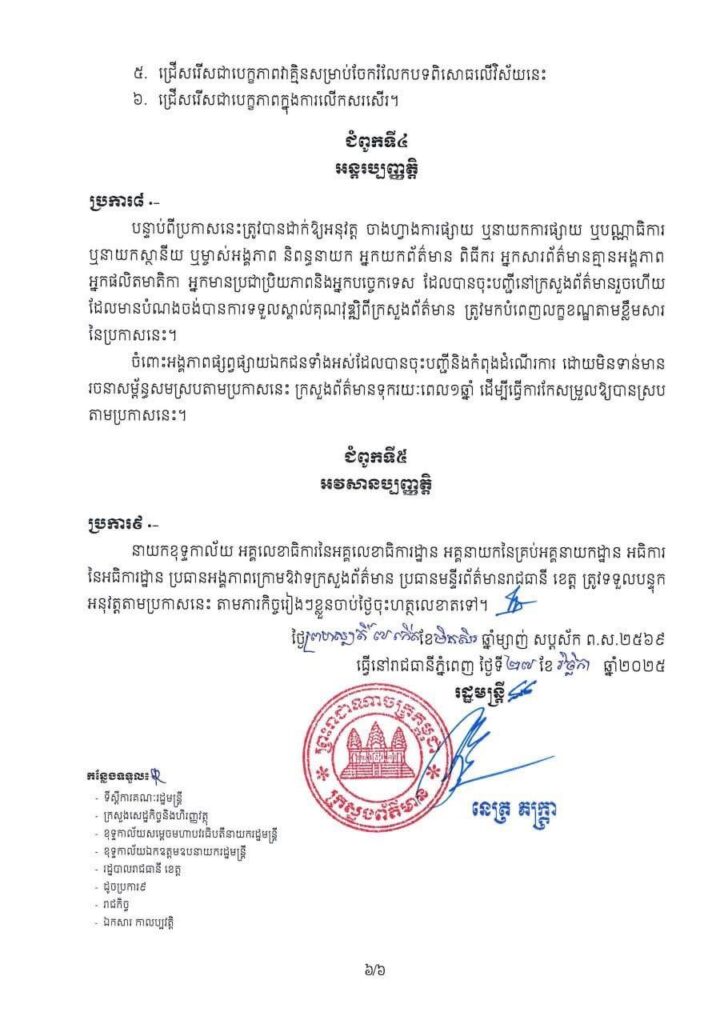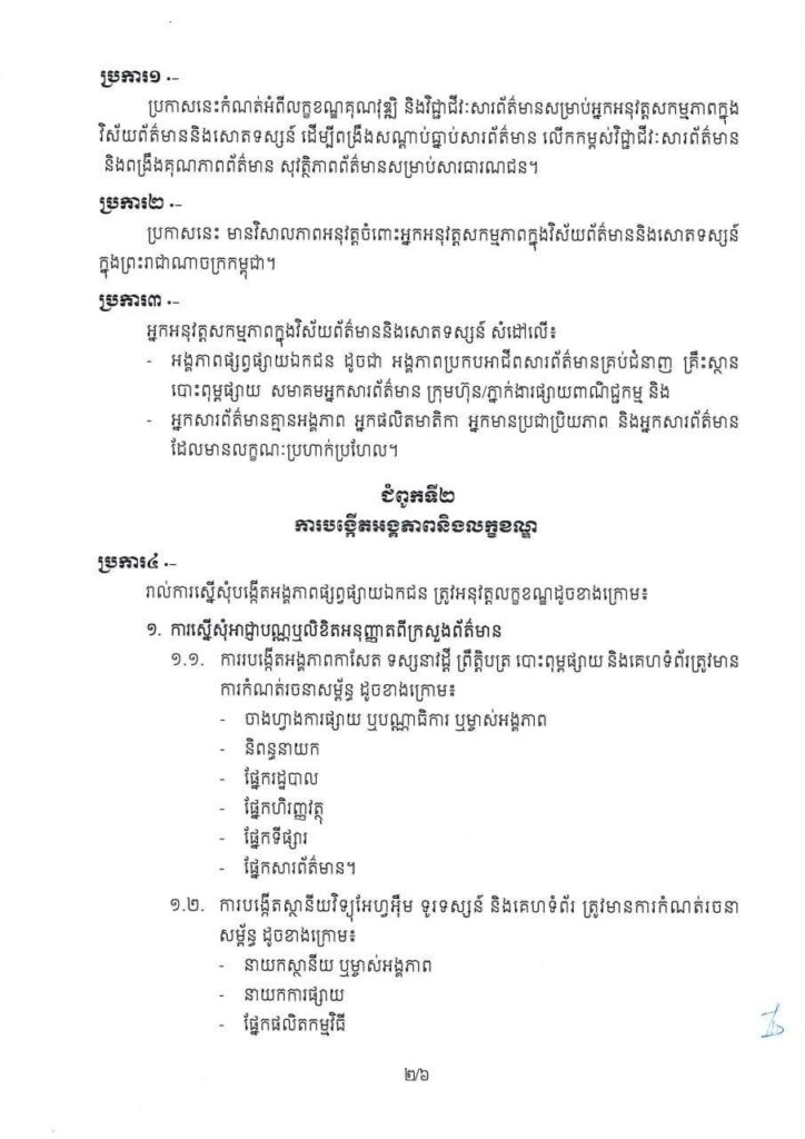 ក្នុងសេចក្តីប្រកាសព័ត៌មានចេញនៅថ្ងៃទី ២៧ ខែវិច្ឆិកា ឆ្នាំ២០២៥ ដែលមានចំនួន ៥ជំពូក ដោយបានភ្ជាប់ជាមួយលក្ខខណ្ឌមួយចំនួនដូចជា៖ ការរបង្កើតអង្គភាពកាសែត ទស្សនាវដ្ដី ព្រឹត្តិបត្រ បោះពុម្ពផ្សាយ និងគេហទំព័រត្រូវបានការកំណត់រចនាសម្ព័ន្ធដូចជា ៖ ចាងហ្វាងការផ្សាយ ឬបណ្ណាធិការ ឬម្ចាស់អង្គភាព,និពន្ធនាយក,ផ្នែករដ្ឋបាល,ផ្នែកហិរញ្ញវត្ថុ,ផ្នែកទីផ្សារ,ផ្នែកសារព័ត៌មាន។ ដោយឡែកចំពោះការបង្កើតស្ថានីយវិទ្យុអែហ្វអឹម ទូរទស្សន៍ និងគេហទំព័រ ត្រូវមានការកំណត់រចនាសម្ព័ន្ធ ដូចជា៖នាយកស្ថានីយ ឬម្ចាស់អង្គភាព,នាយកការផ្សាយ,ផ្នែកផលិត កម្មវិធី, ផ្នែកព័ត៌មាន ,ផ្នែកពិធីករ,ផ្នែកបច្ចេកទេស,ផ្នែករដ្ឋបាល,ផ្នែកហិរញ្ញវត្ថុ និងផ្នែកទីផ្សារ។