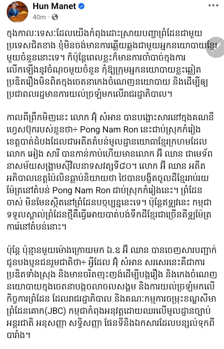 តាមរយៈបណ្ដាញសង្គម នារសៀលថ្ងៃទី២៧ ខែវិច្ឆិកា ឆ្នាំ២០២៥ សម្ដេចធិបតី ហ៊ុន ម៉ាណែត បានលើកឡើងថា ក្នុងកាលៈទេសៈដែលយើងកំពុងដោះស្រាយបញ្ហាព្រំដែនជាមួយប្រទេសជិតខាង ខ្ញុំមិនចង់មានការឆ្លើយឆ្លងជាមួយអ្នកនយោបាយខ្មែរមួយចំនួននោះទេ។ ក៏ប៉ុន្តែពេលខ្លះក៏មានការចាំបាច់ក្នុងការលើកឡើងនូវចំណុចមួយចំនួន កុំឱ្យក្រុមអ្នកនយោបាយខ្លះឆ្លៀតប្រឌិតរឿងមិនពិតក្នុងចេតនាកេងចំណេញនយោបាយ និងដើម្បីឱ្យប្រជាពលរដ្ឋមានការយល់ច្រឡំមកលើរាជរដ្ឋាភិបាល។