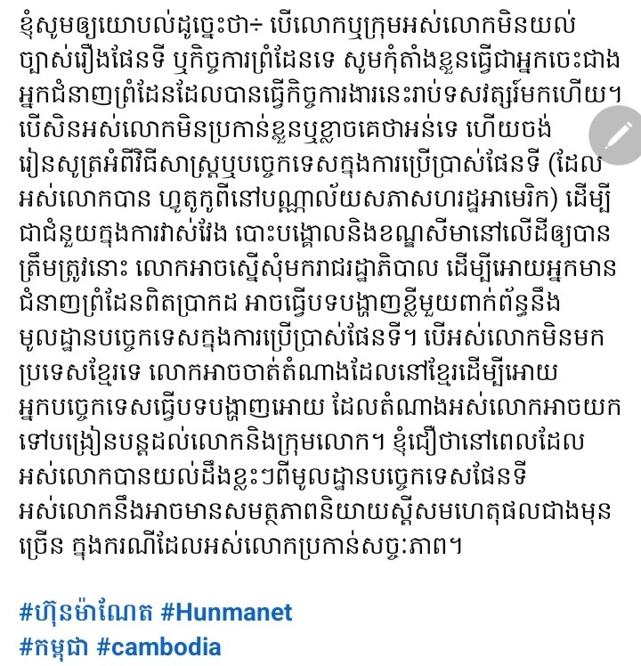 សម្ដេចធិបតី សូមឱ្យយោបល់ដូច្នេះថា÷ បើលោកឬក្រុមអស់លោកមិនយល់ច្បាស់រឿងផែនទី ឬកិច្ចការព្រំដែនទេ សូមកុំតាំងខ្លួនធ្វើជាអ្នកចេះជាងអ្នកជំនាញព្រំដែនដែលបានធ្វើកិច្ចការងារនេះរាប់ទសវត្សរ៍មកហើយ។ បើសិនអស់លោកមិនប្រកាន់ខ្លួនឬខ្លាចគេថាអន់ទេ ហើយចង់រៀនសូត្រអំពីវិធីសាស្ត្រឬបច្ចេកទេសក្នុងការប្រើប្រាស់ផែនទី (ដែលអស់លោកបាន ហ្វូតូកូពីនៅបណ្ណាល័យសភាសហរដ្ឋអាមេរិក) ដើម្បីជាជំនួយក្នុងការវាស់វែង បោះបង្គោលនិងខណ្ឌសីមានៅលើដីឱ្យបានត្រឹមត្រូវនោះ លោកអាចស្នើសុំមករាជរដ្ឋាភិបាល ដើម្បីឱ្យអ្នកមានជំនាញព្រំដែនពិតប្រាកដ អាចធ្វើបទបង្ហាញខ្លីមួយពាក់ព័ន្ធនឹងមូលដ្ឋានបច្ចេកទេសក្នុងការប្រើប្រាស់ផែនទី។ បើអស់លោកមិនមកប្រទេសខ្មែរទេ លោកអាចចាត់តំណាងដែលនៅខ្មែរដើម្បីឱ្យអ្នកបច្ចេកទេសធ្វើបទបង្ហាញឱ្យ ដែលតំណាងអស់លោកអាចយកទៅបង្រៀនបន្តដល់លោកនិងក្រុមលោក។