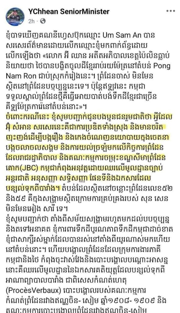 ប៉ុន្តែប៉ុន្មានមួយម៉ោងក្រោយមក ឯ.ឧ អ៊ី ឈាន បានចេញសារបញ្ជាក់ជូនបងប្អូនជនរួមជាតិថា÷ អ្វីដែល អ៊ុ សំអាន សរសេរនេះគឺជាការប្រឌិតទាំងស្រុង និងមានចរិតញុះញង់ដើម្បីបង្ករឿង និងកេងចំណេញនយោបាយក្នុងចេតនាបង្កចលាចលសង្គម និងការយល់ច្រឡំមកលើកិច្ចការព្រំដែន ដែលរាជរដ្ឋាភិបាល និងគណៈកម្មការចម្រុះខណ្ឌសីមាព្រំដែនគោក (JBC) កម្ពុជា កំពុងអនុវត្តដោយឈរលើមូលដ្ឋានច្បាប់អន្ដរជាតិ អនុសញ្ញា សទ្ធិសញ្ញា ផែនទីនិងឯកសារដែលបន្សល់ទុកពីបារាំង។