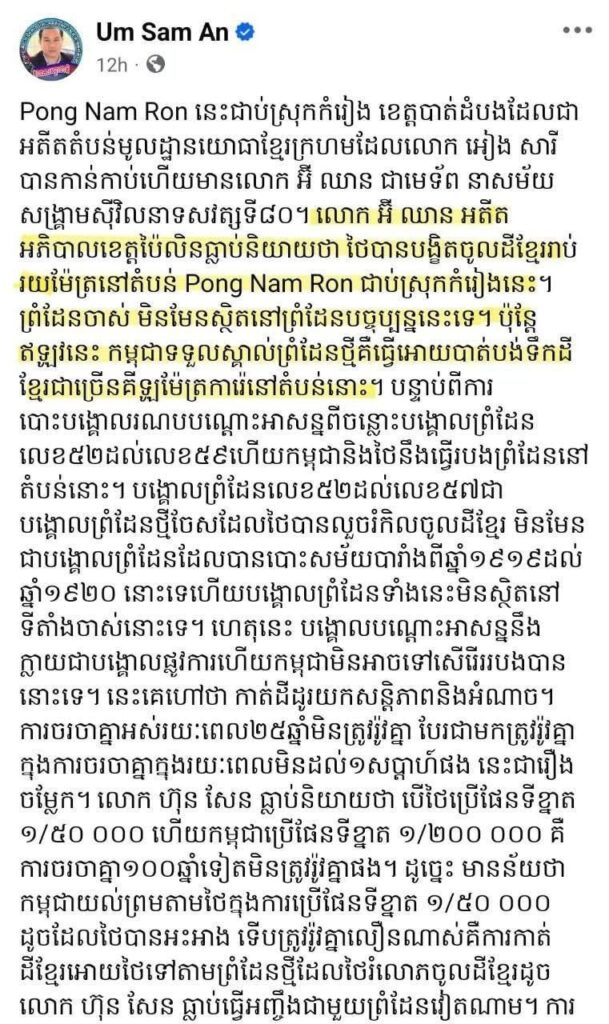 កាលពីព្រឹកមិញនេះ លោក អ៊ុ សំអាន បានបង្ហោះសារនៅក្នុងគណនីហ្វេសប៊ុករបស់ខ្លួនថា÷ Pong Nam Ron នេះជាប់ស្រុកកំរៀង ខេត្តបាត់ដំបង ដែលជាអតីតតំបន់មូលដ្ឋានយោធាខ្មែរក្រហមដែល លោក អៀង សារី បានកាន់កាប់ហើយមាន លោក អ៊ី ឈាន ជាមេទ័ព នាសម័យសង្រ្គាមសុីវិលនាទសវត្សទី៨០។ លោក អ៊ី ឈាន អតីតអភិបាលខេត្តប៉ៃលិនធ្លាប់និយាយថា ថៃបានបង្ខិតចូលដីខ្មែររាប់រយម៉ែត្រនៅតំបន់ Pong Nam Ron ជាប់ស្រុកកំរៀងនេះ។ ព្រំដែនចាស់ មិនមែនស្ថិតនៅព្រំដែនបច្ចុប្បន្ននេះទេ។ ប៉ុន្តែឥឡូវនេះ កម្ពុជាទទួលស្គាល់ព្រំដែនថ្មីគឺធ្វើឱ្យបាត់បង់ទឹកដីខ្មែរជាច្រើនគីឡូម៉ែត្រការ៉េនៅតំបន់នោះ។