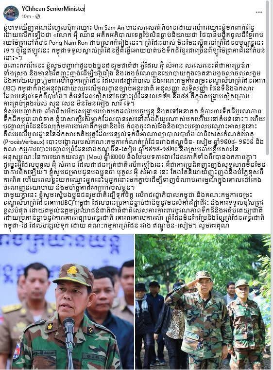 ប៉ុន្តែប៉ុន្មានមួយម៉ោងក្រោយមក ឯ.ឧ អ៊ី ឈាន បានចេញសារបញ្ជាក់ជូនបងប្អូនជនរួមជាតិថា÷ អ្វីដែល អ៊ុំ សំអាន សរសេរនេះ គឺជាការប្រឌិតទាំងស្រុង និងមានចរិតញុះញង់ដើម្បីបង្ករឿង និងកេងចំណេញនយោបាយក្នុងចេតនាបង្កចលាចលសង្គម និងការយល់ច្រឡំមកលើកិច្ចការព្រំដែន ដែលរាជរដ្ឋាភិបាល និងគណៈកម្មការចម្រុះខណ្ឌសីមាព្រំដែនគោក(JBC) កម្ពុជាកំពុងអនុវត្តដោយឈរលើមូលដ្ឋានច្បាប់អន្ដរជាតិ អនុសញ្ញា សទ្ធិសញ្ញា ផែនទីនិងឯកសារដែលបន្សល់ទុកពីបារាំង។