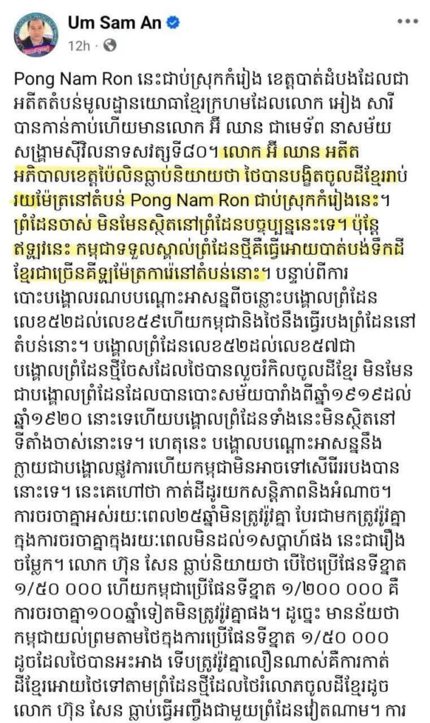សម្តេចធិបតី ហ៊ុន ម៉ាណែត បានបន្តថា កាលពីព្រឹកមិញនេះ លោក អ៊ុំ សំអាន បានបង្ហោះសារនៅក្នុងគណនីហ្វេសប៊ុករបស់ខ្លួនថា Pong Nam Ron នេះជាប់ស្រុកកំរៀង ខេត្តបាត់ដំបង ដែលជាអតីតតំបន់មូលដ្ឋានយោធាខ្មែរក្រហម ដែលលោក អៀង សារី បានកាន់កាប់ហើយមានលោក អ៊ី ឈាន ជាមេទ័ព នាសម័យសង្រ្គាមស៊ីវិលនាទសវត្សទី៨០។ លោក អ៊ី ឈាន អតីតអភិបាលខេត្តប៉ៃលិន ធ្លាប់និយាយថា ថៃបានបង្ខិតចូលដីខ្មែររាប់រយម៉ែត្រនៅតំបន់ Pong Nam Ron ជាប់ស្រុកកំរៀងនេះ។ ព្រំដែនចាស់ មិនមែនស្ថិតនៅព្រំដែនបច្ចុប្បន្ននេះទេ។ ប៉ុន្តែឥឡូវនេះ កម្ពុជាទទួលស្គាល់ព្រំដែនថ្មីគឺធ្វើឱ្យបាត់បង់ទឹកដីខ្មែរជាច្រើនគីឡូម៉ែត្រការ៉េនៅតំបន់នោះ។