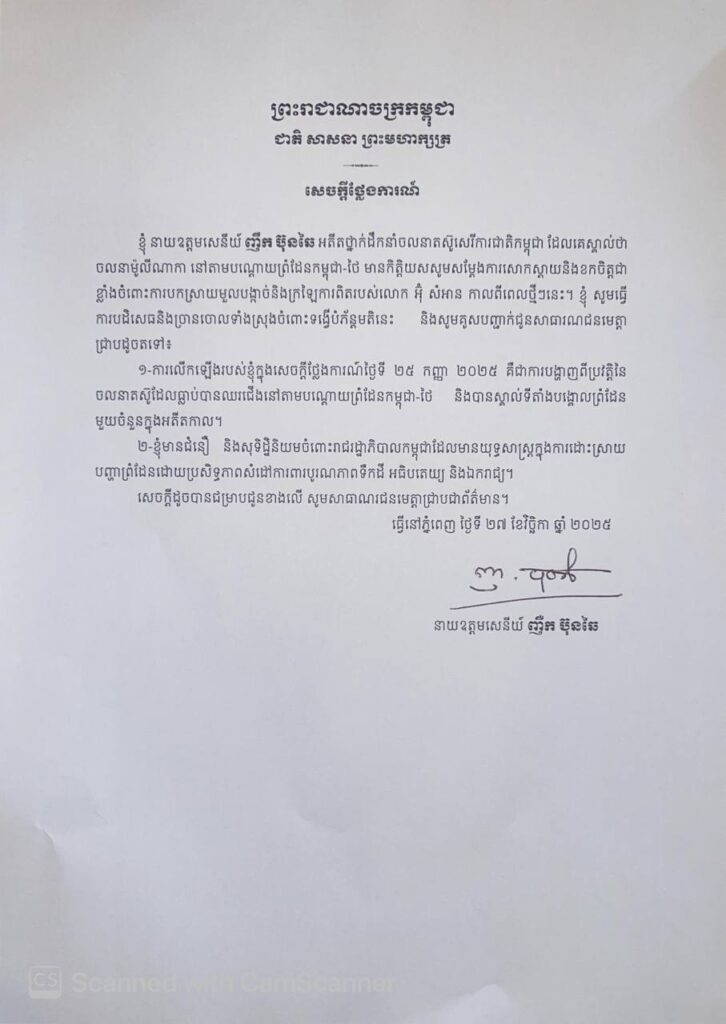 នាយឧត្តមសេនីយ៍ ញឹក ប៊ុនឆៃ បានបដិសេធនិងច្រានចោលទាំងស្រុងចំពោះទង្វើបំភ័ន្តមតិនេះ និងបានគូសបញ្ជាក់ជូនសាធារណជនមេត្តាជ្រាបដូចតទៅ៖