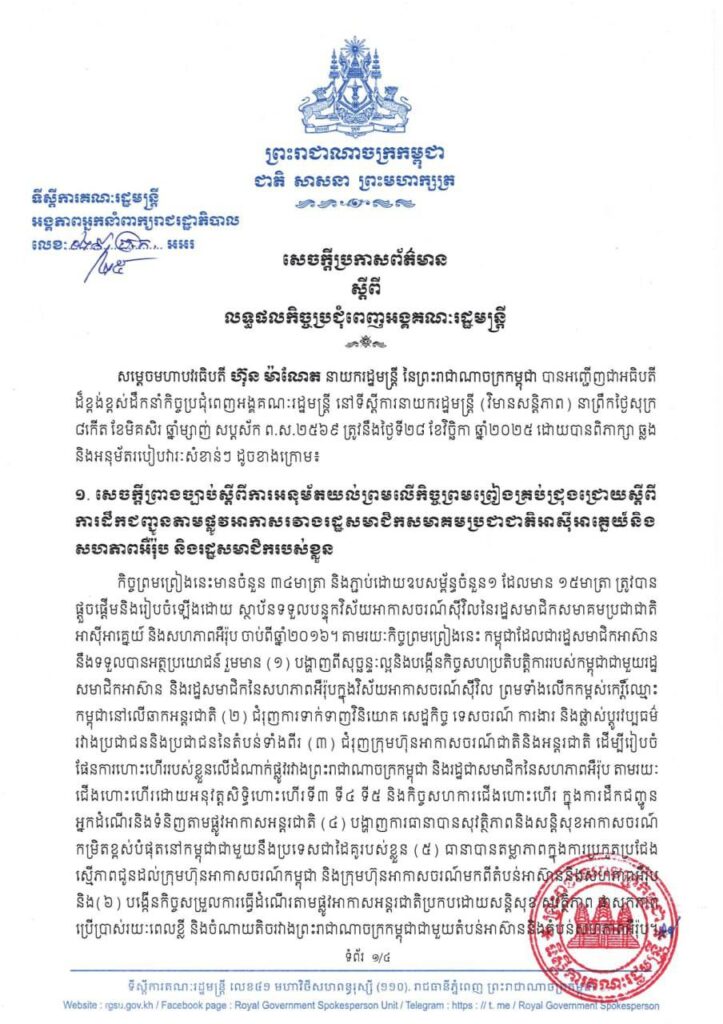 (ភ្នំពេញ)៖ កិច្ចប្រជុំពេញអង្គគណៈរដ្ឋមន្ត្រី បានអនុម័តលើសេចក្តីព្រាងច្បាប់ ស្តីពីការអនុម័តយល់ព្រមលើពិធីសារទី៣ ស្តីពីការពង្រីកសិទ្ធិហោះហើរទី៥ រវាងភាគីចុះកិច្ចព្រមព្រៀង ក្រោមកិច្ចព្រមព្រៀងដឹកជញ្ជូនតាមផ្លូវអាកាស រវាងរដ្ឋាភិបាលនៃរដ្ឋសមាជិកសមាគមប្រជាជាតិអាស៊ីអាគ្នេយ៍និងរដ្ឋាភិបាលនៃសាធារណរដ្ឋប្រជាមានិតចិន ។ នេះបើតាមសេចក្តីប្រកាសព័ត៌មាន ស្តីពី លទ្ធផលកិច្ចប្រជុំពេញអង្គគណៈរដ្ឋមន្រ្តី ក្រោមអធិបតីភាពសម្តេចមហាបវរធិបតី ហ៊ុន ម៉ាណែត នាយករដ្ឋមន្ត្រី នៃព្រះរាជាណាចក្រកម្ពុជា នាព្រឹកថ្ងៃទី២៨ ខែវិច្ឆិកា ឆ្នាំ២០២៥។