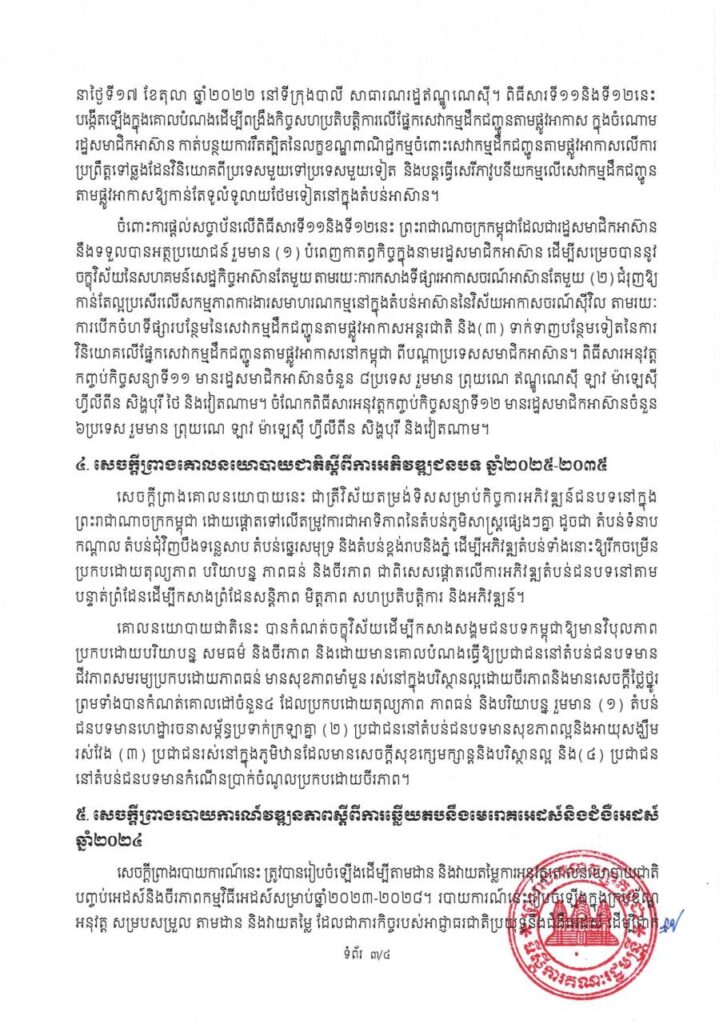 (ភ្នំពេញ)៖ កិច្ចប្រជុំពេញអង្គគណៈរដ្ឋមន្ត្រីបានអនុម័តលើសេចក្តីព្រាងច្បាប់ ស្តីពីការអនុម័តយល់ព្រមលើពិធីសារអនុវត្តកញ្ចប់កិច្ចសន្យាទី១១និងទី១២ នៃសេវាកម្មដឹកជញ្ជូនតាមផ្លូវអាកាសក្រោមកិច្ចព្រមព្រៀងក្របខ័ណ្ឌអាស៊ានស្តីពីសេវាកម្ម ។ នេះបើតាមសេចក្តីប្រកាសព័ត៌មាន ស្តីពី លទ្ធផលកិច្ចប្រជុំពេញអង្គគណៈរដ្ឋមន្រ្តី ក្រោមអធិបតីភាពសម្តេចមហាបវរធិបតី ហ៊ុន ម៉ាណែត នាយករដ្ឋមន្ត្រី នៃព្រះរាជាណាចក្រកម្ពុជា នាព្រឹកថ្ងៃទី២៨ ខែវិច្ឆិកា ឆ្នាំ២០២៥ ។