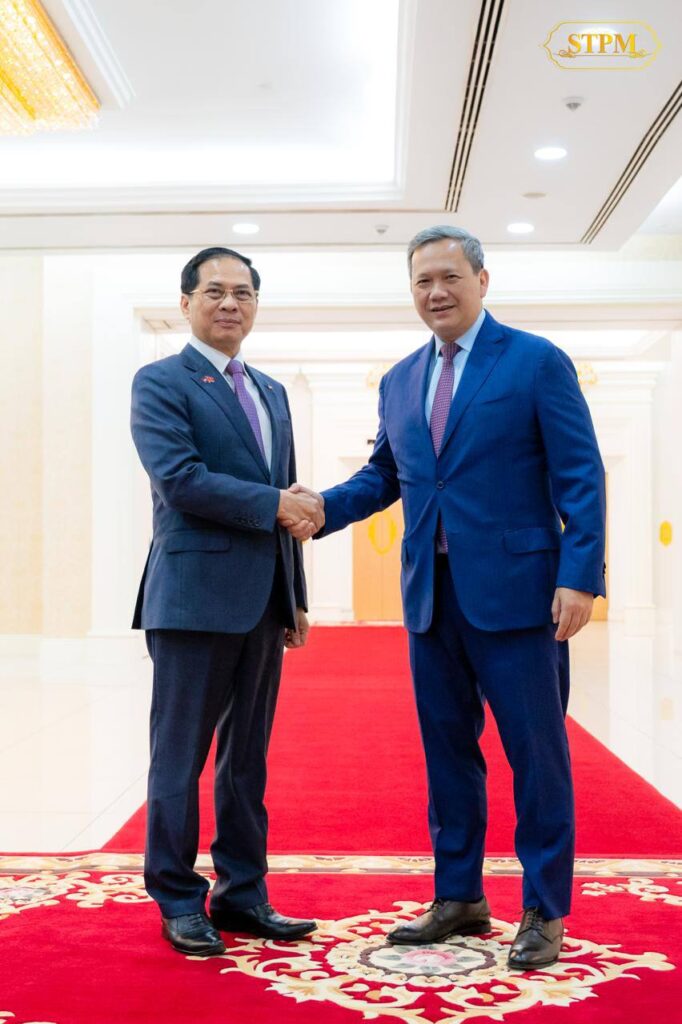 (ភ្នំពេញ)៖ សម្តេចមហាបវរធិបតី ហ៊ុន ម៉ាណែត នាយករដ្ឋមន្ត្រី នៃព្រះរាជាណាចក្រកម្ពុជា និង ឯកឧត្តម Bui Thanh Son ឧបនាយករដ្ឋមន្ត្រីនៃសាធារណរដ្ឋសង្គមនិយមវៀតណាម បានឯកភាពគ្នា បន្តជំរុញទំនាក់ទំនង និងកិច្ចសហប្រតិបត្តិការទ្វេភាគី ឱ្យកាន់តែរឹងមាំ ។ នេះបើតាមលទ្ធផលនៃជំនួបរវាងសម្ដេចធិបតី និងឧបនាយករដ្ឋមន្ត្រីវៀតណាម នារសៀលថ្ងៃទី២៨ ខែវិច្ឆិកា ឆ្នាំ២០២៥ នៅវិមានសន្តិភាព ដែលបានបង្ហោះលើបណ្ដាញសង្គម ។