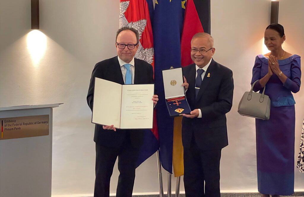 ភ្នំពេញ៖ឯកឧត្តមបណ្ឌិត ចែម វីឌ្យ៉ា ប្រធានគណៈកម្មការកិច្ចការបរទេស សហប្រតិបត្តិការអន្តរជាតិ និងព័ត៌មាន នៃព្រឹទ្ធសភា បានអញ្ជើញទទួលគ្រឿងឥស្សរិយយស Grand Cross of Merit with Star of the Order of Merit of the Federal Republic of Germany របស់សាធារណរដ្ឋសហព័ន្ធអាល្លឺម៉ង់ ពី ឯកឧត្តមប្រធានាធិបតីនៃសាធារណរដ្ឋសហព័ន្ធអាល្លឺម៉ង់ ។