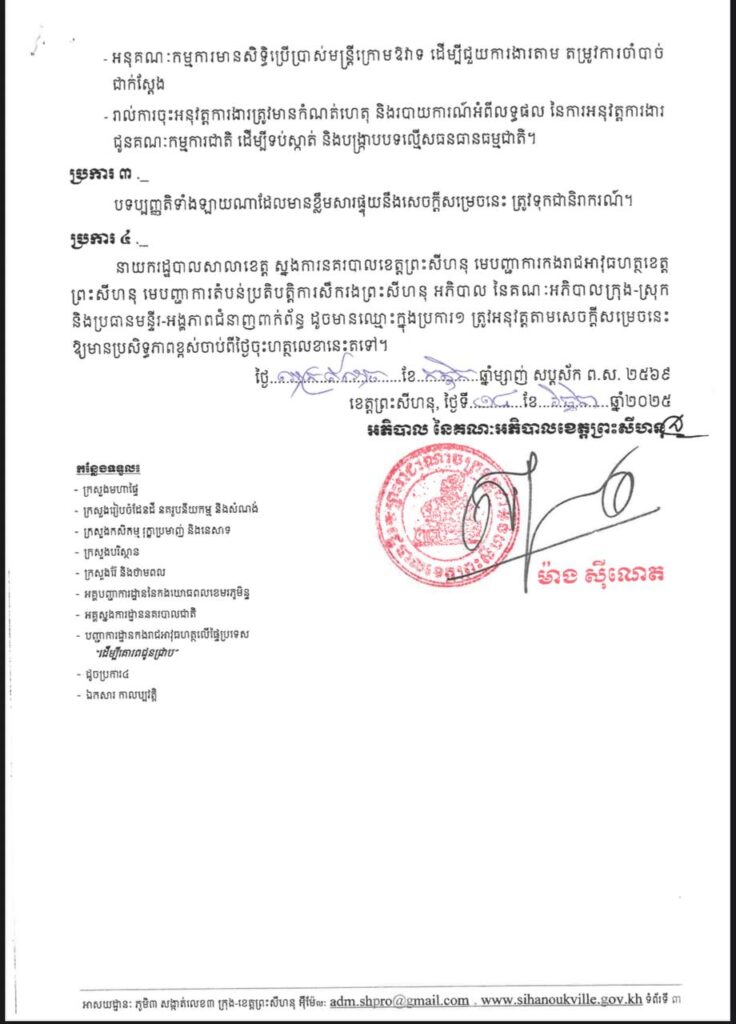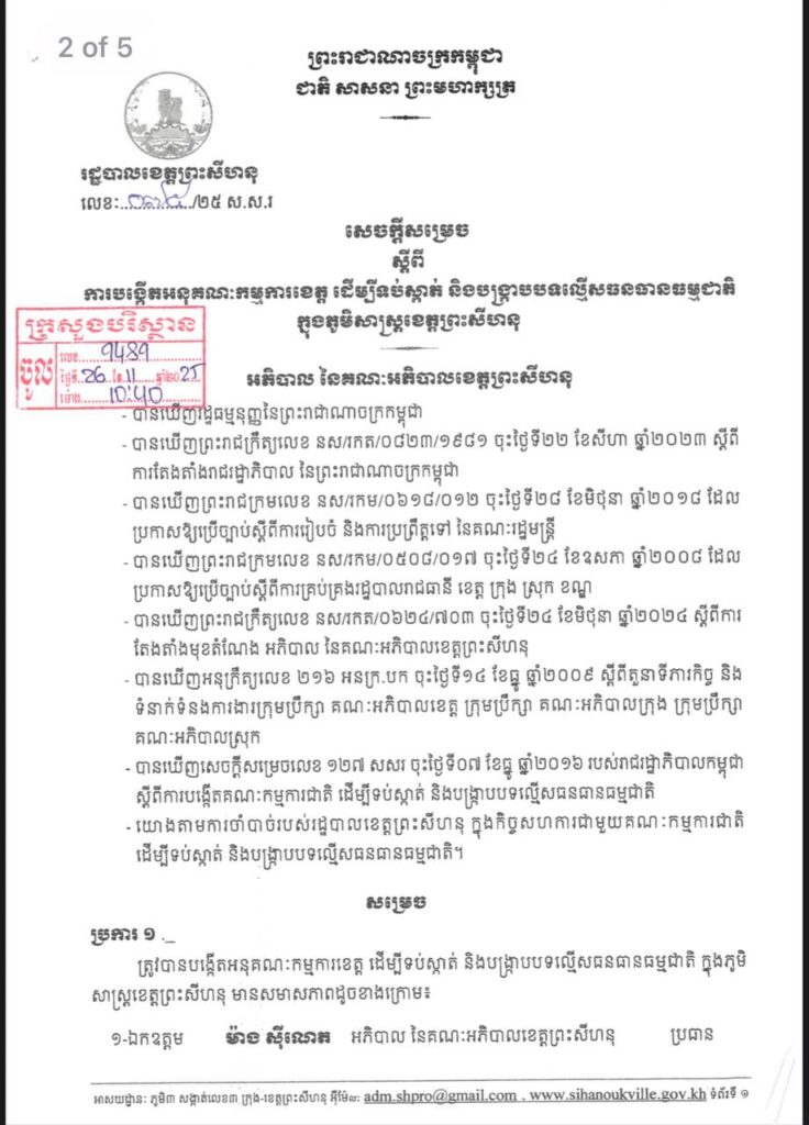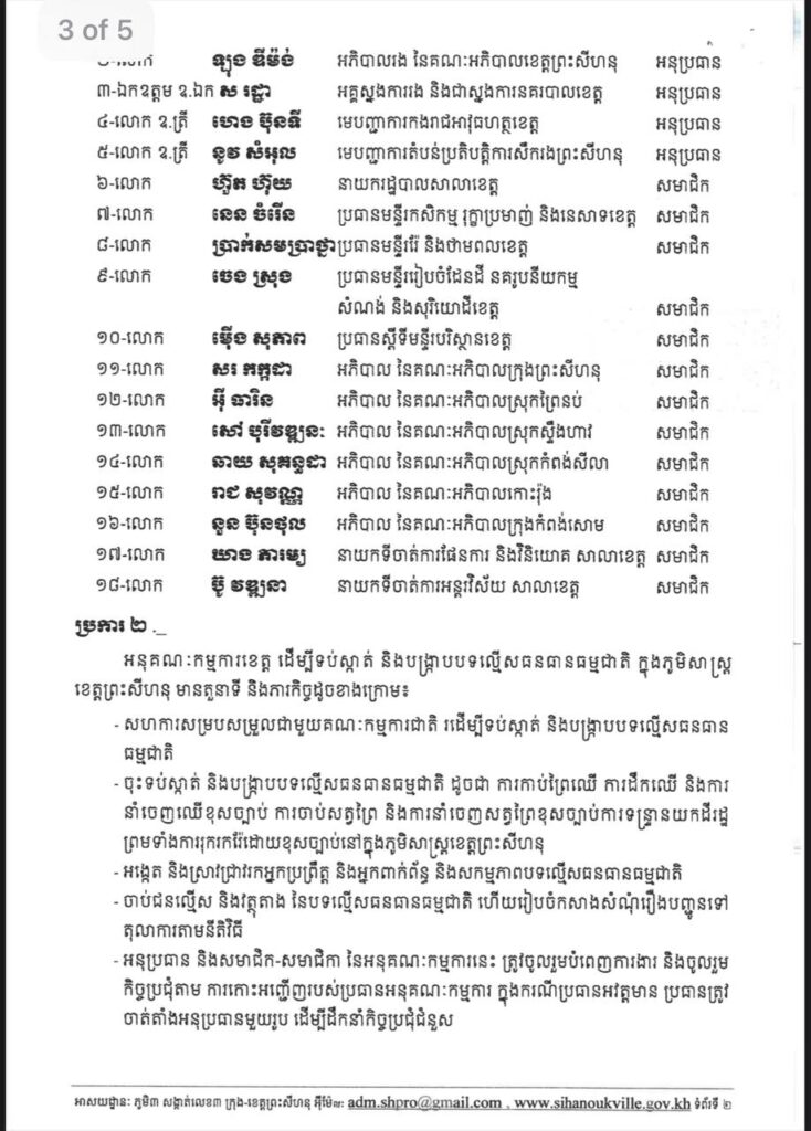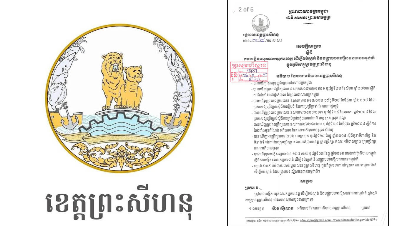 (ព្រះសីហនុ)៖ រដ្ឋបាលខេត្តព្រះសីហនុ បានចេញសម្រេចបង្កើតអនុគណៈកម្មការខេត្ត ដើម្បីទប់ស្កាត់ និងបង្ក្រាបបទល្មើសធនធានធម្មជាតិ ក្នុងភូមិសាស្ត្រខេត្តព្រះសីហនុ។ យោងតាមរយៈសេចក្តីសម្រេចចុះថ្ងៃទី២៤ ខែវិច្ឆិកា ឆ្នាំ២០២៥ អនុគណៈកម្មការនេះ ដឹកនាំដោយឯកឧត្តម ម៉ាង ស៊ីណេត អភិបាលនៃគណៈអភិបាលខេត្ត ជាប្រធាន អមដោយអនុប្រធាន៤រូប និងសមាជិក សមាជិក ជាច្រើនរូបទៀត។