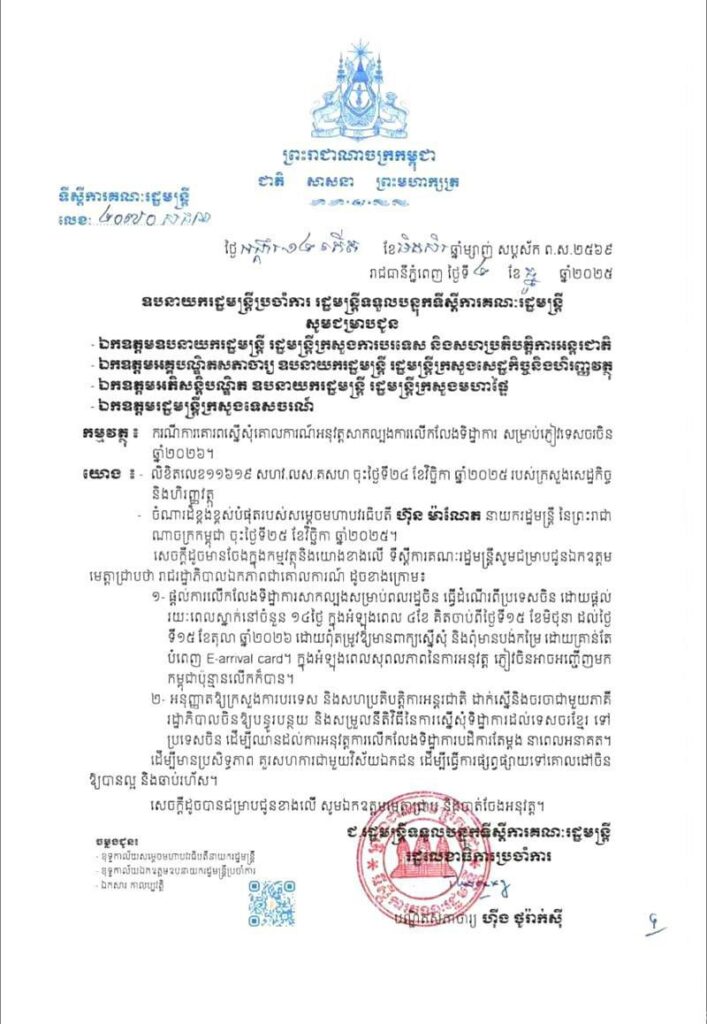 ភ្នំពេញ៖ រាជរដ្ឋាភិបាលកម្ពុជាសម្រេចលើកលែងទិដ្ឋាការសាកល្បងសម្រាប់ពលរដ្ឋចិនធ្វើដំណើរពីប្រទេសចិន ដោយផ្តល់ រយៈពេលស្នាក់នៅចំនួន១៤ថ្ងៃ និងចាប់ផ្ដើមអនុវត្តគិតចាប់ពីថ្ងៃទី១៥ មិថុនា-ថ្ងៃទី១៥ តុលា ២០២៦។នេះបើយោងតាមលិខិតរបស់