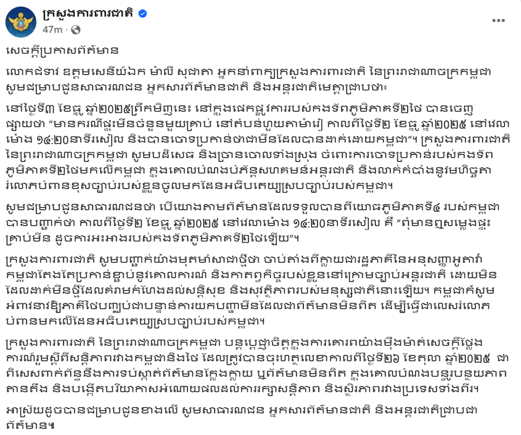 ក្រសួងការពារជាតិ នៃព្រះរាជាណាចក្រកម្ពុជា បន្តប្តេជ្ញាចិត្តក្នុងការគោរពយ៉ាងម៉ឺងម៉ាត់សេចក្តីថ្លែងការណ៍រួមស្តីពីសន្តិភាពរវាងកម្ពុជានិងថៃ ដែលត្រូវបានចុះហត្ថលេខាកាលពីថ្ងៃទី២៦ ខែតុលា ឆ្នាំ២០២៥ ជាពិសេសពាក់ព័ន្ធនឹងការទប់ស្កាត់ព័ត៌មានក្លែងក្លាយ ឬព័ត៌មានមិនពិត ក្នុងគោលបំណងបន្ធូរបន្ថយភាពតានតឹង និងបង្កើតបរិយាកាសអំណោយផលដល់ការរក្សាសន្តិភាព និងស្ថិរភាពរវាងប្រទេសទាំងពីរ៕