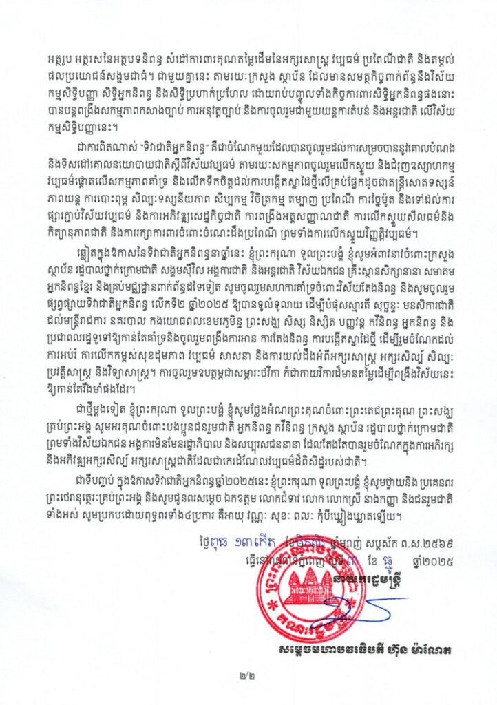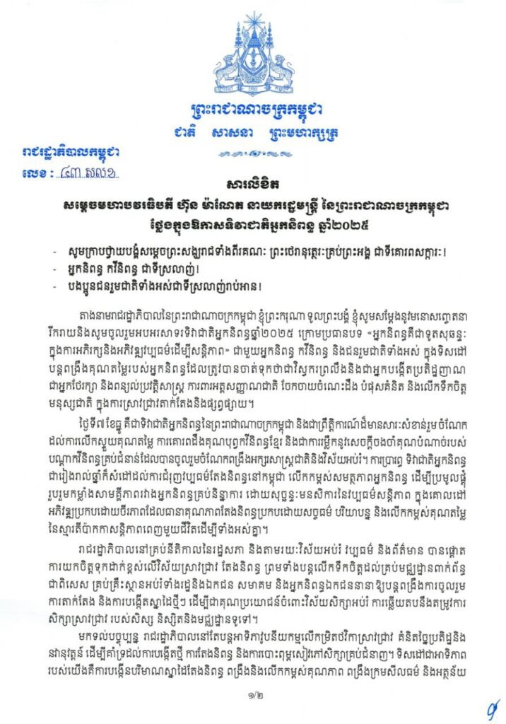ឆ្លៀតក្នុងឱកាសនៃទិវាជាតិអ្នកនិពន្ធនាឆ្នាំនេះ សម្ដេចនាយករដ្ឋមន្ត្រី សូមអំពាវនាវចំពោះក្រសួង ស្ថាប័ន រដ្ឋបាលថ្នាក់ក្រោមជាតិ សង្គមស៊ីវិល អង្គការជាតិ និងអន្តរជាតិ វិស័យឯកជន គ្រឹះស្ថានសិក្សានានា សមាគម អ្នកនិពន្ធខ្មែរ និងគ្រប់មជ្ឈដ្ឋានពាក់ព័ន្ធដទៃទៀត សូមចូលរួមសហការគាំទ្រចំពោះវិស័យតែងនិពន្ធ និងសូមចូលរួម ផ្សព្វផ្សាយទិវាជាតិអ្នកនិពន្ធ លើកទី២ ឆ្នាំ២០២៥ ឱ្យបានទូលំទូលាយ ដើម្បីបំផុសស្មារតី សុច្ឆន្ទៈ មនសិការជាតិ ដល់មន្ត្រីរាជការ នគរបាល កងយោធពលខេមរភូមិន្ទ ព្រះសង្ឃ សិស្ស និស្សិត បញ្ញវន្ត កវីនិពន្ធ អ្នកនិពន្ធ និង ប្រជាពលរដ្ឋទូទៅឱ្យកាន់តែគាំទ្រនិងចូលរួមពង្រឹងការអាន ការតែងនិពន្ធ ការបង្កើតស្នាដៃថ្មី ដើម្បីរួមចំណែកដល់ ការអប់រំ ការលើកកម្ពស់សុខដុមភាព វប្បធម៌ សាសនា និងការយល់ដឹងអំពីអក្សរសាស្ត្រ អក្សរសិល្ប៍ សិល្បៈ ប្រវត្តិសាស្ត្រ និងវិទ្យាសាស្ត្រ។ ការចូលរួមឧបត្ថម្ភជាសម្ភារៈថវិកា ក៏ជាកាយវិការដ៏មានតម្លៃដើម្បីពង្រឹងវិស័យនេះ ឱ្យកាន់តែរឹងមាំផងដែរ ។