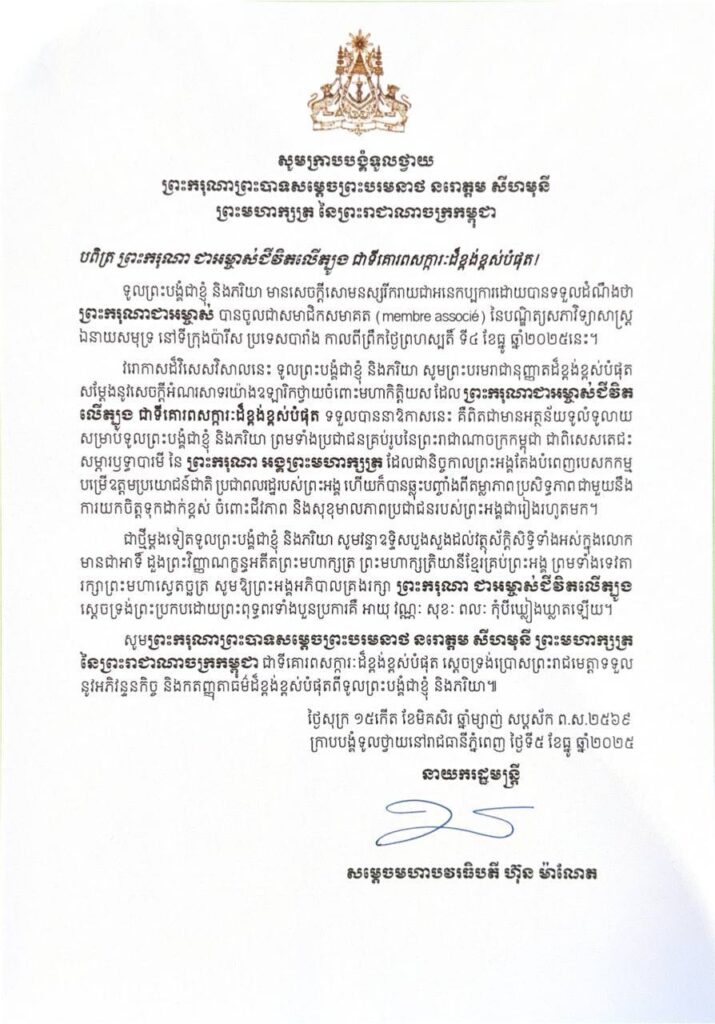 ភ្នំពេញ៖ សម្តេចមហាបវរធិបតី ហ៊ុន ម៉ាណែត នាយករដ្ឋមន្ត្រីនៃព្រះរាជាណាចក្រកម្ពុជា បានគោរពថ្វាយសារលិខិតជូនព្រះករុណាព្រះបាទសម្តេចព្រះបរមនាថ នរោត្តម សីហមុនី ព្រះមហាក្សត្រ នៃព្រះរាជាណាចក្រកម្ពុជា ក្នុងឱកាសដ៏ វិសេសវិសាល ព្រះករុណាជាអម្ចាស់ជីវិតលើត្បូង បានចូលជាសមាជិកសមាគត (membre associé) នៃបណ្ឌិត្យសភា វិទ្យាសាស្ត្រ ឯនាយសមុទ្រ នៅទីក្រុងប៉ារីស ប្រទេសបារាំងកាលពីព្រឹកថ្ងៃព្រហស្បតិ៍ ទី៤ ខែធ្នូ ឆ្នាំ២០២៥។