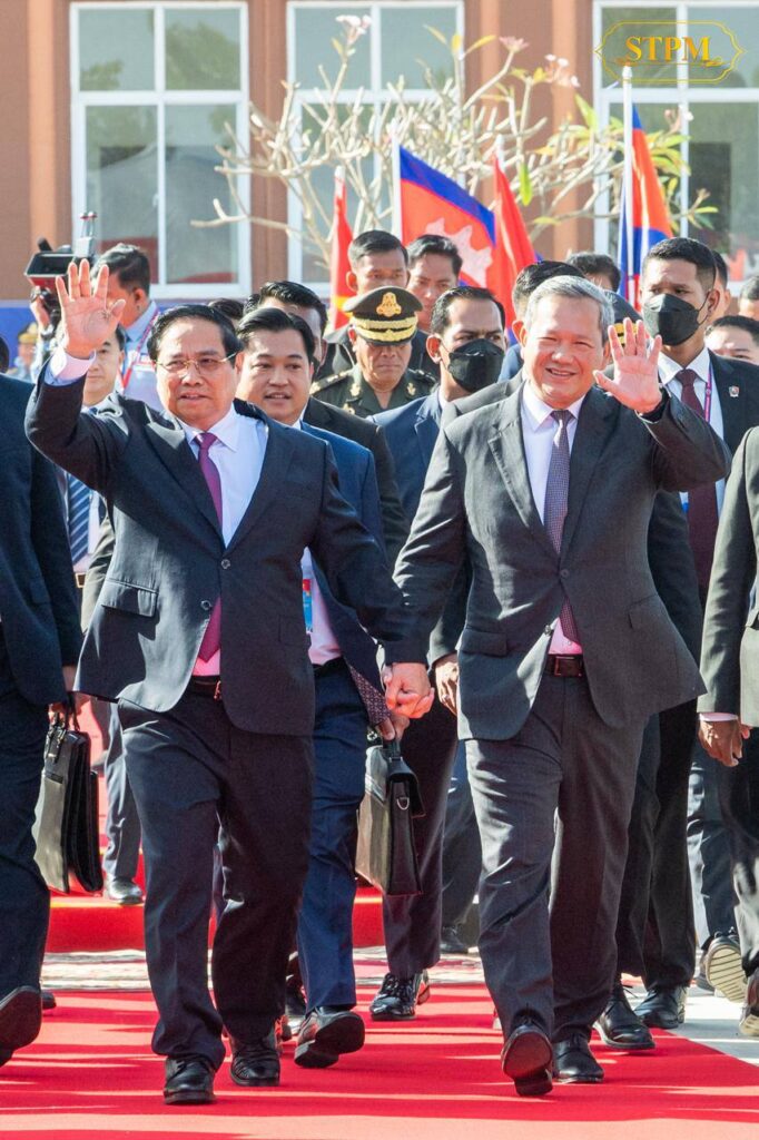 ខេត្តព្រៃវែង៖ សម្ដេចមហាបវរធិបតី ហ៊ុន ម៉ាណែត នាយករដ្ឋមន្ត្រីកម្ពុជា រួមជាមួយ ឯកឧត្តម ផាម មិញ ជិញ (Pham Minh Chinh) នាយករដ្ឋមន្រ្តី នៃសាធារណរដ្ឋសង្គមនិយមវៀតណាម អញ្ជើញចូលរួម សម្ពោធដាក់ឱ្យដំណើរការជាផ្លូវការ ច្រកទ្វារព្រំដែនអន្តរជាតិម៉ឺនជ័យ ខេត្តព្រៃវែង-តឹនណាម ខេត្តតៃនិញ នាព្រឹកថ្ងៃទី៨ ធ្នូ ២០២៥ ។