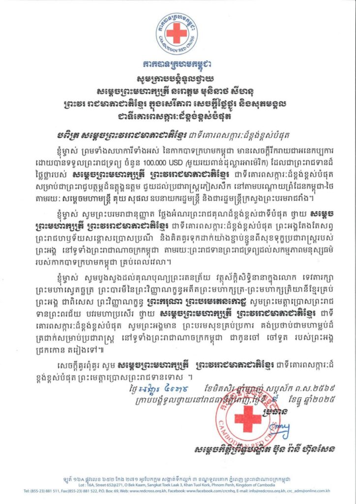 សារលិខិតនោះមានខ្លឹមសារថា៖ «ខ្ញុំម្ចាស់ ព្រមទាំងសហការីទាំងអស់ នៃកាកបាទក្រហមកម្ពុជា មានសេចក្តីរីករាយជាអនេកប្បការ ដោយបានទទួលព្រះរាជទ្រព្យ ចំនួន ១០០.០០០ដុល្លារ(មួយរយពាន់ដុល្លារអាម៉េរិក) ដែលជាព្រះរាជទានដ៏ថ្លៃថ្លារបស់ សម្ដេចព្រះមហាក្សត្រី ព្រះវររាជមាតាជាតិខ្មែរ ជាទីគោរពសក្ការៈដ៏ខ្ពង់ខ្ពស់បំផុត សម្រាប់ជាព្រះរាជូបត្ថម្ភដ៏ឧត្តុង្គឧត្តម ជួយដល់ប្រជារាស្ត្រភៀសសឹក នៅតាមបណ្ដោយព្រំដែនកម្ពុជា-ថៃ តាមរយៈ សម្តេចមហាមន្ត្រី គុយ សុផល ឧបនាយករដ្ឋមន្ត្រី និងជារដ្ឋមន្ត្រីក្រសួងព្រះបរមរាជវាំង។
