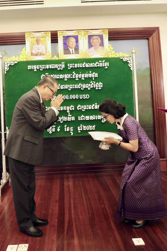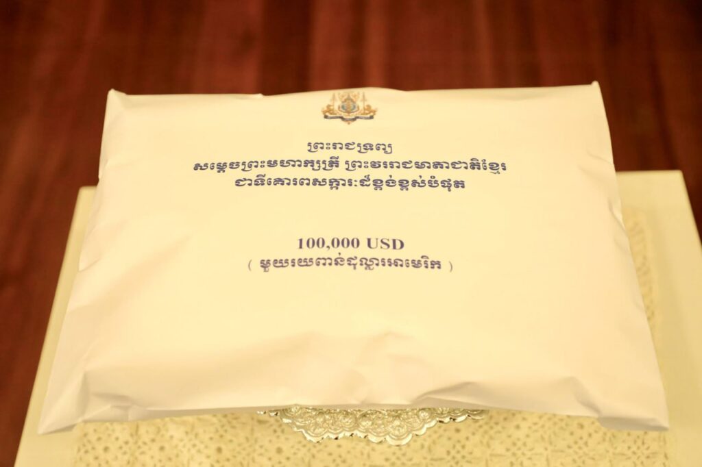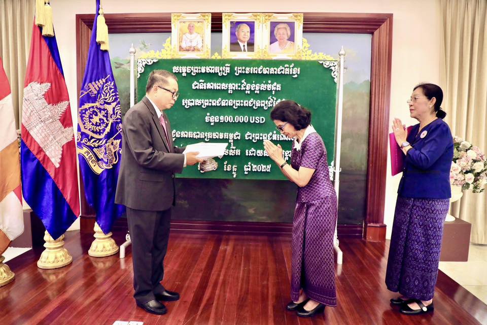 ព្រះរាជទ្រព្យដ៏ឧត្តុង្គឧត្តមខាងលើនេះត្រូវបាន សម្តេចមហាមន្ត្រី គុយ សុផល ឧបនាយករដ្ឋមន្ត្រី និងជារដ្ឋមន្ត្រីក្រសួងព្រះបរមរាជវាំង ប្រគល់ជូនលោកជំទាវ ពុំ ចន្ទីនី កាកបាទក្រហមកម្ពុជា តំណាងដ៏ខ្ពង់ខ្ពស់សម្តេចកិត្តិព្រឹទ្ធបណ្ឌិត ប៊ុន រ៉ានី ហ៊ុនសែន ប្រធានកាកបាទក្រហមកម្ពុជា នៅសាលប្រជុំក្រសួងព្រះបរមរាជវាំង នាព្រឹកថ្ងៃអង្គារ ទី៩ ខែធ្នូ ឆ្នាំ២០២៥ ។