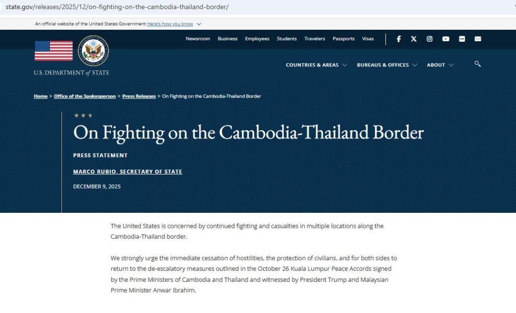 តាមរយៈគេហទំព័រផ្លូវការ ដែលបានចេញផ្សាយ អំពីសេចក្តីថ្លែងការណ៍របស់លោក Marco Rubio រដ្ឋមន្ត្រីការបរទេសអាមេរិក កាលពីថ្ងៃទី៩ ខែធ្នូ, ក្រសួងបានរៀបរាប់ថា «សហរដ្ឋអាមេរិកមានការព្រួយបារម្ភ ពីការបន្តប្រយុទ្ធគ្នា, ការស្លាប់និងរបួសមនុស្ស នៅច្រើនទីតាំង តាមបណ្តោយព្រំដែនកម្ពុជា-ថៃ»។