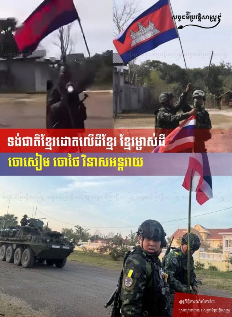 សំឡឹងមើលរូបមួយនេះ អ្នកនឹងឃើញអំពីវីរៈភាពដ៏អង់អាចក្លាហានមុះមុតរបស់វីរៈកងទ័ពកម្ពុជាក្នុងការការពារទឺកដី និងប្រជាជន។ ទង់ជាតិចោរឈ្លានពានត្រូវបានកាច់បំបាក់ទម្លាក់ដល់ដី បន្ទាប់ទង់ចោរមួយនេះ មានវត្តមាននៅលើទឹកដីកម្ពុជាតែប៉ុន្មានម៉ោងប៉ុណ្ណោះ។ វីរៈកងទ័ពកម្ពុជាមិនខ្លាចធ្វើសង្គ្រាមច្បាំងនឹងខ្មាំងសត្រូវនោះទេ ប៉ុន្តែយើងយល់យ៉ាងច្បាស់នូវវិនាសកម្មបង្កដោយសង្គ្រាម។ ជាក់ស្តែងពេលនេះ វីរៈកងទ័ពយើងត្រូវបង្ខំចិត្តតបតយ៉ាងដាច់ណាត់ជាមួយខ្មាំងសៀម ក្នុងបុព្វហេតុការពារអធិបតេយ្យជាតិ បូរណភាពទឹកដី និងប្រជាជនកម្ពុជា ពីការឈ្លានពានទាំងកំរោល និងសាហាវព្រៃផ្សៃ ពីភាគីសៀម ដោយគ្មានជម្រើស៕