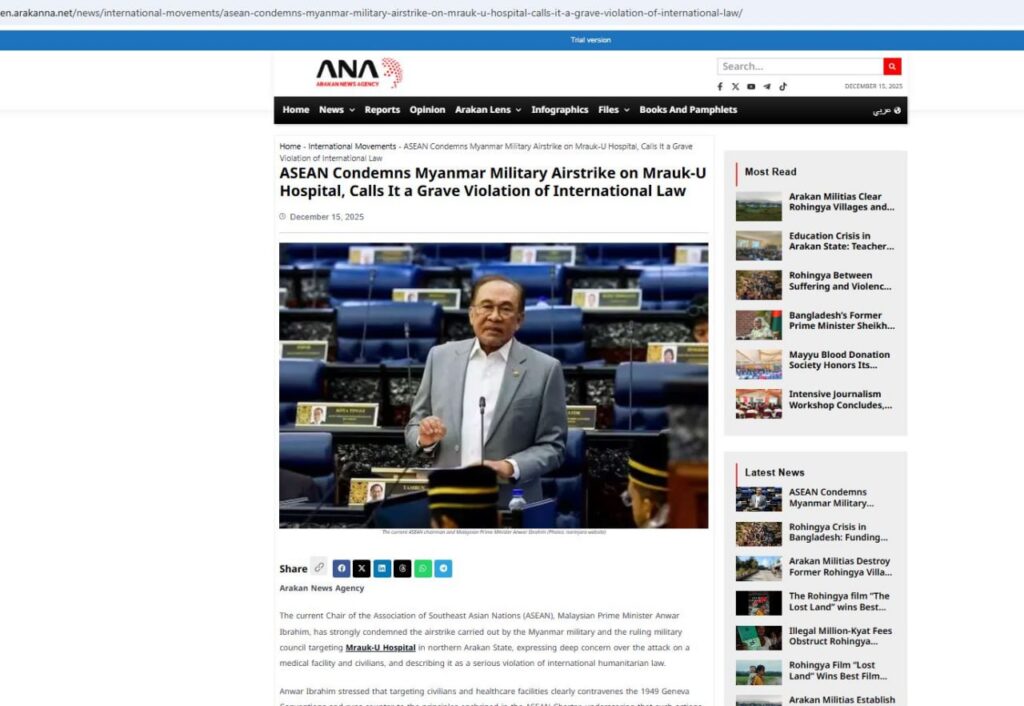 យោងតាមការចេញផ្សាយ របស់សារព័ត៌មាន Arakan កាលពីថ្ងៃចន្ទ, លោក អាន់វ៉ា អ៊ីប្រាហ៊ីម ប្រធានអាស៊ាន និង ជានាយករដ្ឋមន្ត្រីម៉ាឡេស៊ី បានថ្កោលទោសយ៉ាងខ្លាំង ចំពោះការវាយប្រហារតាមផ្លូវអាកាស ដែលធ្វើឡើងដោយយោធាមីយ៉ាន់ម៉ា និង ក្រុមប្រឹក្សាយោធា ដែលកំពុងកាន់អំណាច។
