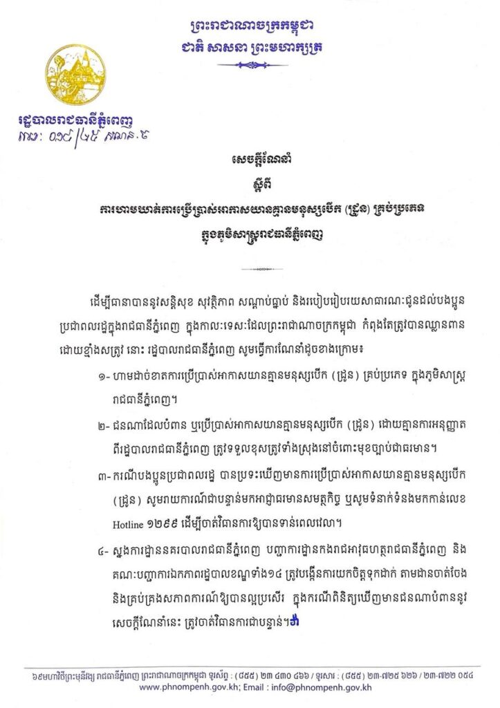 អាន៖សេចក្តីណែនាំដែលមាន៤ចំណុច បានបញ្ជាក់ថា ក្នុងកាលៈទេសៈដែលព្រះរាជាណាចក្រកម្ពុជា កំពុងតែត្រូវបានឈ្លានពានដោយខ្មាំងសត្រូវនោះ រដ្ឋបាលរាជធានីភ្នំពេញ សូមធ្វើការណែនាំដូចខាងក្រោម៖ ១- ហាមដាច់ខាតការប្រើប្រាស់អាកាសយានគ្មានមនុស្សបើក (ដ្រូន) គ្រប់ប្រភេទ ក្នុងភូមិសាស្ត្ររាជធានីភ្នំពេញ។ ២- ជនណាដែលបំពាន ឬប្រើប្រាស់អាកាសយានគ្មានមនុស្សបើក (ដ្រូន) ដោយគ្មានការអនុញ្ញាត ពីរដ្ឋបាលរាជធានីភ្នំពេញ ត្រូវទទួលខុសត្រូវទាំងស្រុងនៅចំពោះមុខច្បាប់ជាធរមាន។ ៣- ករណីបងប្អូនប្រជាពលរដ្ឋ បានប្រទះឃើញមានការប្រើប្រាស់អាកាសយានគ្មានមនុស្សបើក (ដ្រូន) សូមរាយការណ៍ជាបន្ទាន់មកអាជ្ញាធរមានសមត្ថកិច្ច ឬសូមទំនាក់ទំនងមកកាន់លេខ Hotline ១២៩៩ ដើម្បីចាត់វិធានការឱ្យបានទាន់ពេលវេលា។