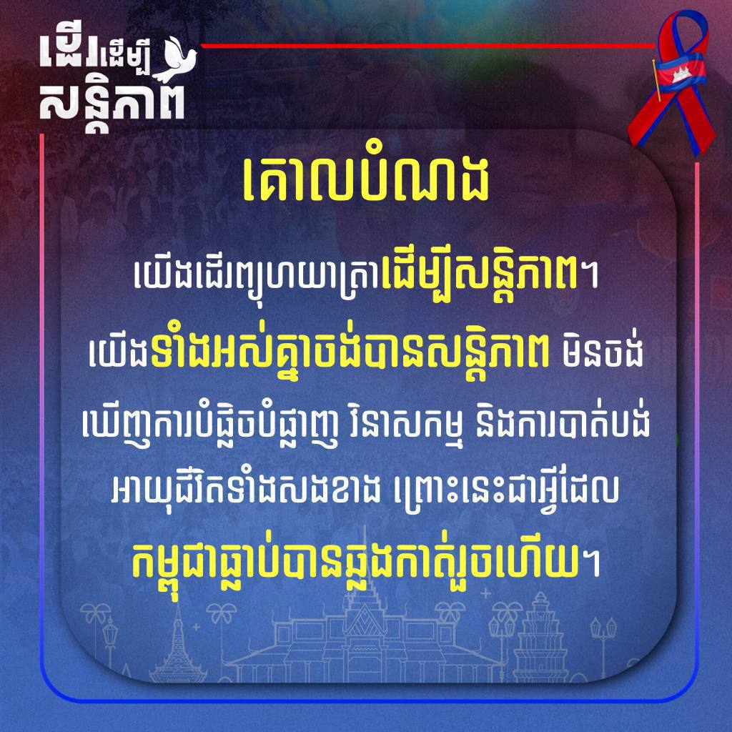 ដើរព្យុហយាត្រាដើម្បីសន្ដិភាព ក៏នឹងបង្ហាញពីការចង់បានសន្ដិភាពរបស់ប្រជាពលរដ្ឋកម្ពុជាគ្រប់រូប ទៅកាន់ពិភពលោកឱ្យបានដឹង គ្រាដែលកម្ពុជា បាននិងកំពុងតែពើបប្រទះជាមួយការឈ្លានពានពីយោធាថៃលើបញ្ហាព្រំដែន រហូតប៉ះទង្កិចដោយអាវុធជាលើកទីពីរ។