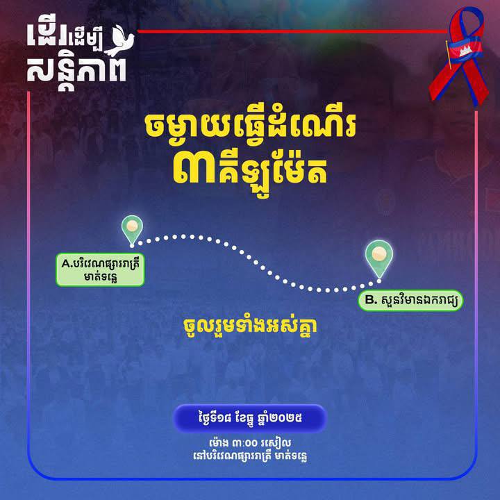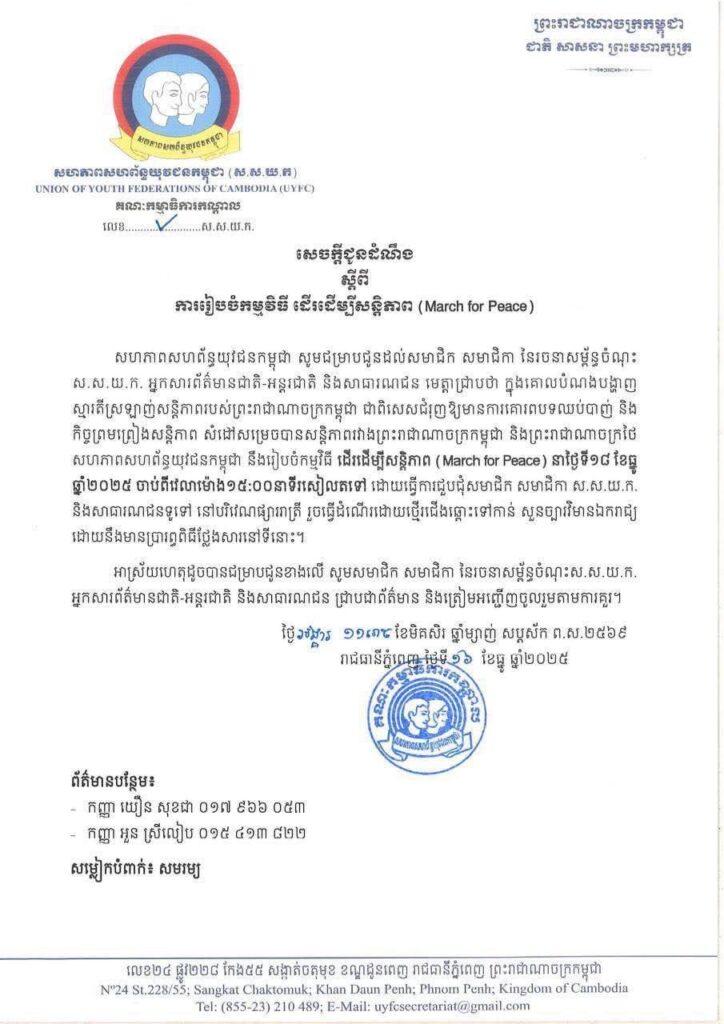យោងតាមសេចក្តីជូនដំណឹង ស្តីពី ការរៀបចំកម្មវិធី ដើរដើម្បីសន្តិភាព (March for Peace) បានឱ្យដឹងថា ក្នុងគោលបំណងបង្ហាញ ស្មារតីស្រឡាញ់សន្តិភាពរបស់ព្រះរាជាណាចក្រកម្ពុជា ជាពិសេសជំរុញឱ្យមានការគោរពបទឈប់បាញ់ និងកិច្ចព្រមព្រៀងសន្តិភាព សំដៅសម្រេចបានសន្តិភាពរវាងព្រះរាជាណាចក្រកម្ពុជា និងព្រះរាជាណាចក្រថៃ សហភាពសហព័ន្ធយុវជនកម្ពុជា នឹងរៀបចំកម្មវិធី ដើរដើម្បីសន្តិភាព (March for Peace) នាថ្ងៃទី១៨ ខែធ្នូ ឆ្នាំ២០២៥ ចាប់ពីវេលាម៉ោង១៥:០០នាទីរសៀលតទៅ ដោយធ្វើការជួបជុំសមាជិក សមាជិកា ស.ស.យ.ក. និងសាធារណជនទូទៅ នៅបរិវេណផ្សាររាត្រី រួចធ្វើដំណើរដោយថ្មើរជើងឆ្ពោះទៅកាន់ សួនច្បារវិមានឯករាជ្យ ដោយនឹងមានប្រារព្ធពិធីថ្លែងសារនៅទីនោះ ៕