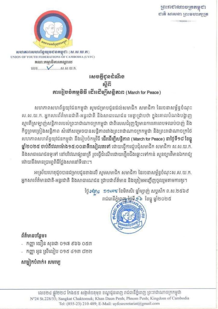 ភ្នំពេញ៖នារសៀលថ្ងៃទី១៨ ខែធ្នូ ឆ្នាំ២០២៥ សហភាពសហព័ន្ធយុវជនកម្ពុជា(ស.ស.យ.ក.) បានផ្តួចផ្តើមរៀបចំកម្មវិធី «ដើរដើម្បីសន្តិភាព» ក្នុងគោលបំណងបង្ហាញស្មារតីស្រលាញ់សន្តិភាពរបស់ព្រះរាជាណាចក្រកម្ពុជា ជាពិសេសជំរុញឱ្យមានការគោរពបទ ឈប់បាញ់ និងកិច្ចព្រមព្រៀមសំដៅសម្រេចបានសន្តិភាពព្រះរាជាណាចក្រកម្ពុជានិងព្រះរាជាណាចក្រថៃ។ នេះបើតាមសេចក្តីជូនដំណឹងរបស់សហភាពសហព័ន្ធយុវជនកម្ពុជា។