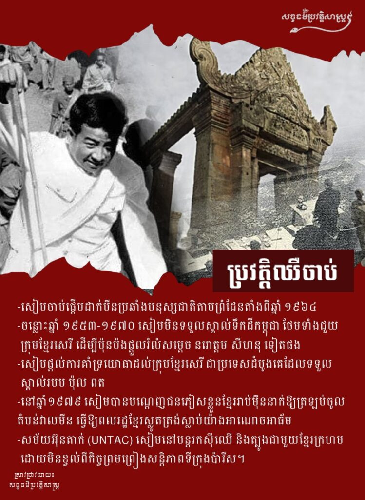 -ចន្លោះឆ្នាំ ១៩៥៣-១៩៧០ សៀមមិនទទួលស្គាល់ទឹកដីកម្ពុជា ថែមទាំងជួយ ក្រុមខ្មែរសេរី ដើម្បីប៉ុនប៉ងផ្តួលរំលំសម្តេច នរោត្តម សីហនុ ទៀតផង -សៀមផ្ដល់ការគាំទ្រយោធាដល់ក្រុមខ្មែរសេរី ជាប្រទេសដំបូងគេដែលទទួល ស្គាល់របប ប៉ុល ពត