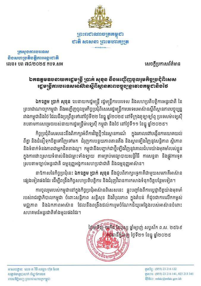 ក្នុងសេចក្តីប្រកាសព័ត៌មាននៅថ្ងៃទី២១ ខែធ្នូ ឆ្នាំ២០២៥ ក្រសួងការបរទេសកម្ពុជាបានបញ្ជាក់ថាកិច្ចប្រជុំពិសេសរដ្ឋមន្ត្រីការបរទេសអាស៊ានស្ដីពីស្ថានភាពបច្ចុប្បន្នរវាងកម្ពុជានិងថៃ ដែលនឹងប្រព្រឹត្តទៅនៅថ្ងៃទី២២ ខែធ្នូ ឆ្នាំ២០២៥ នៅទីក្រុងគូឡាឡាំពួ ប្រទេសម៉ាឡេស៊ី ធ្វើឡើងតបតាមការសម្រេចរបស់នាយករដ្ឋមន្ត្រីម៉ាឡេស៊ី កម្ពុជា និងថៃ នៅថ្ងៃទី១១ ខែធ្នូ ឆ្នាំ២០២៥។