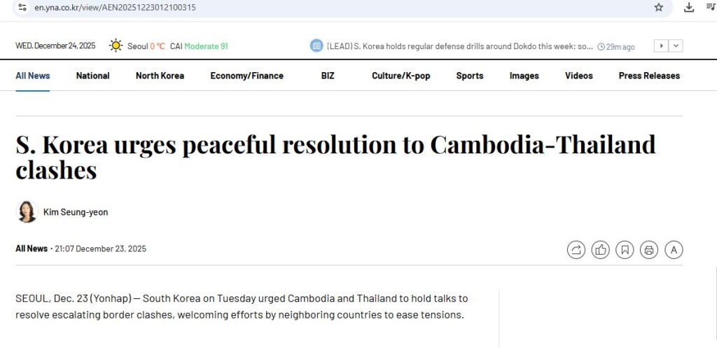 ទីភ្នាក់ងារព័ត៌មានមួយនេះ បានរៀបរាប់ថា «កូរ៉េខាងត្បូង កាលពីថ្ងៃអង្គារ បានជំរុញឱ្យកម្ពុជា និងថៃ ជួបពិភាក្សាគ្នា ដោយសន្តិវិធី ដើម្បីដោះស្រាយការប៉ះទង្គិចគ្នា នៅតាមព្រំដែន ដែលកើនឡើងកម្តៅ ដោយស្វាគមន៍កិច្ចខិតខំប្រឹងប្រែង របស់ប្រទេសជិតខាងនឹងគ្នាទាំងពីរ ដើម្បីបន្ធូរបន្ថយភាពតានតឹង។