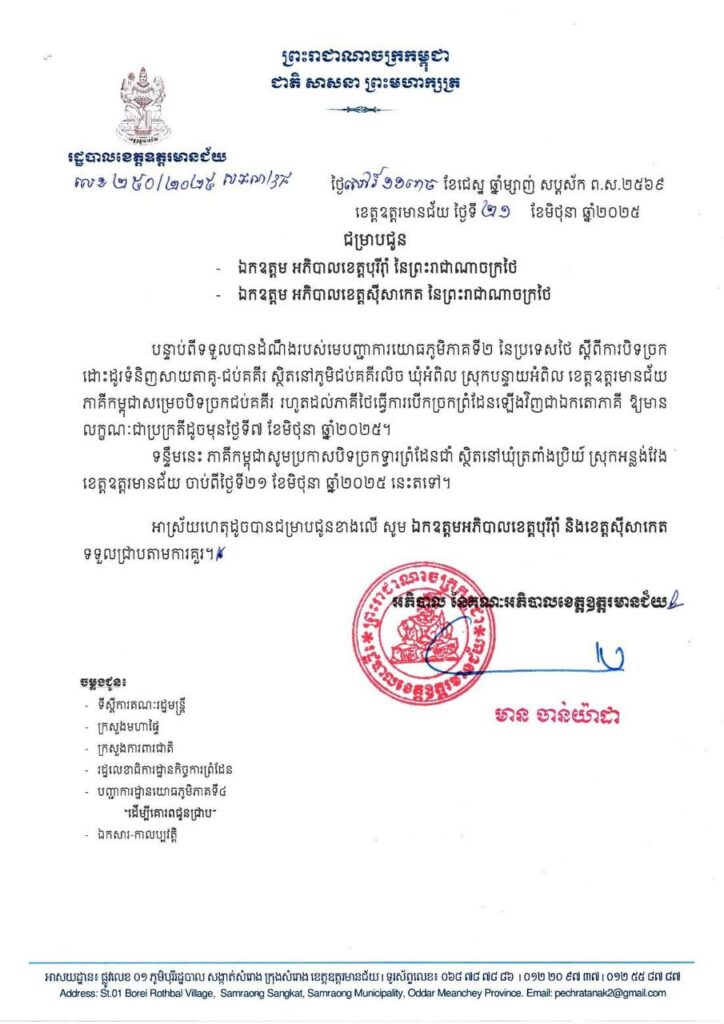 ខ្ញុំបានឯកភាពឱ្យរដ្ឋបាលខេត្តឧត្តរមានជ័យ សម្រេចបិទច្រកនេះខាងកម្ពុជាជាអចិន្ត្រៃយ៍វិញដែរគឺ ច្រកជប់គគីរ និងបិទច្រកមួយបន្ថែមទៀតតែម្ដង គឺច្រកទ្វារព្រំដែនជាំ ស្ថិតក្នុងស្រុកអន្លង់វែង ខេត្តឧត្តរមានជ័យ ចាប់ពីថ្ងៃនេះតទៅ ហើយឱ្យជូនដំណឹងទៅភាគីថៃវិញផងដែរ។