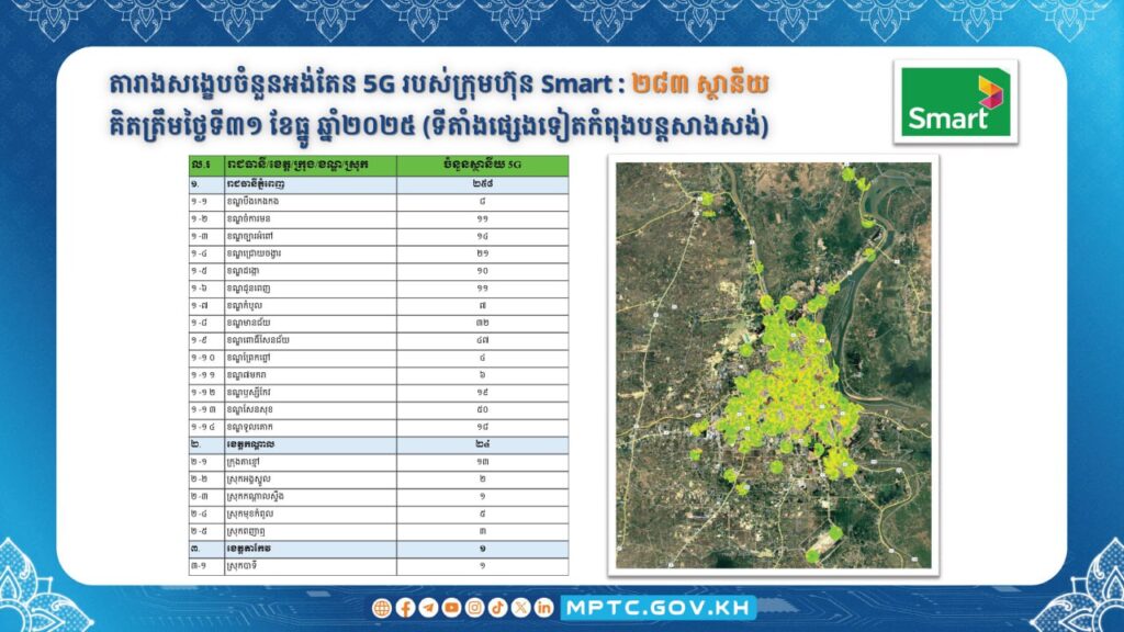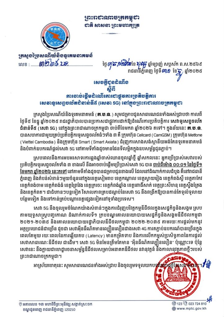 សេវា 5G នៅកម្ពុជានឹងចាប់ផ្តើមដាក់ឱ្យដំណើរការចាប់ពីម៉ោង ០០:០១នាទី ថ្ងៃទី១ ខែមករា ឆ្នាំ២០២៦តទៅ