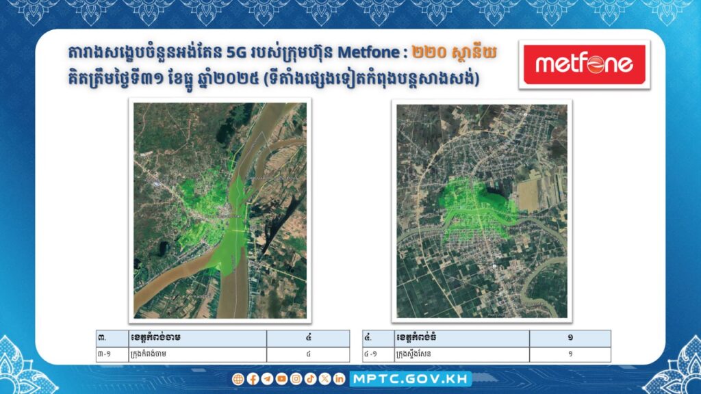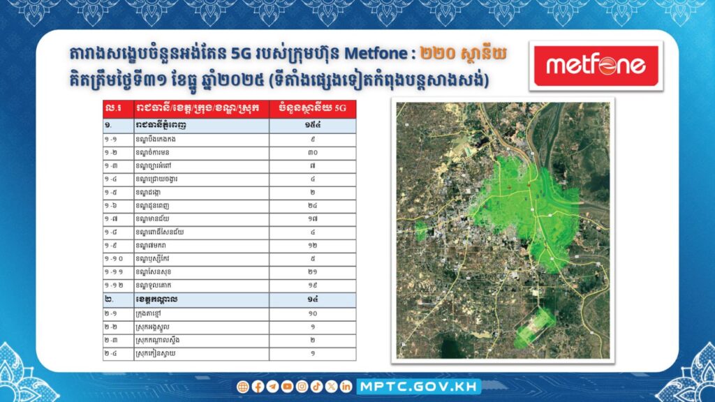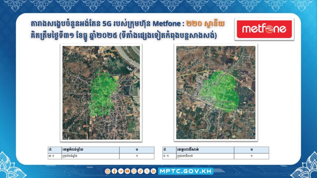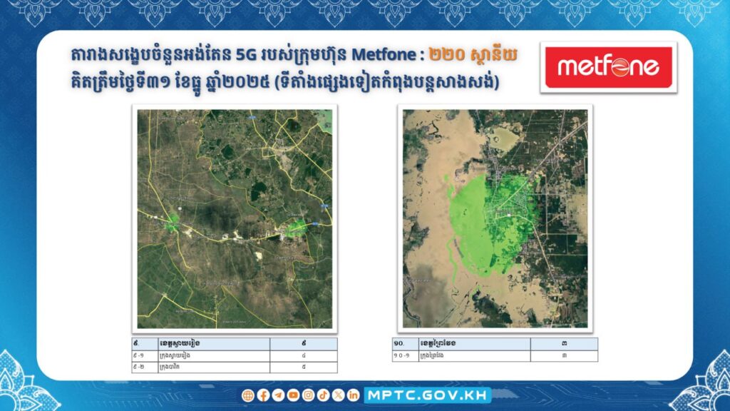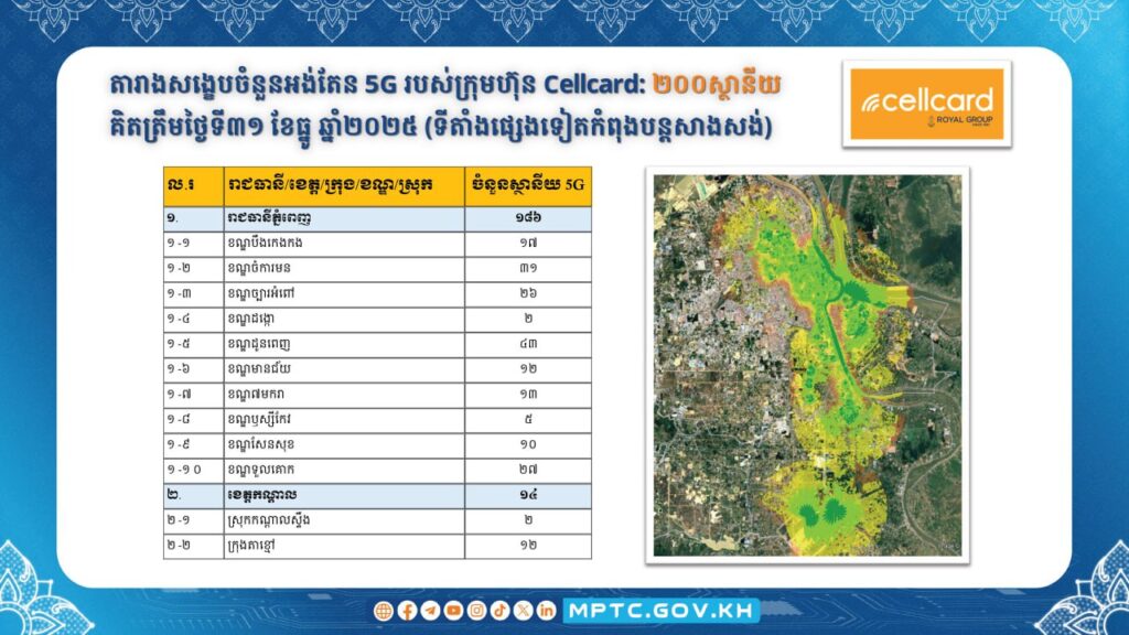 (ភ្នំពេញ)៖ ក្រសួងប្រៃសណីយ៍ និងទូរគមនាគមន៍ បានប្រកាសថា កាលពីថ្ងៃទី៥ ខែធ្នូ ឆ្នាំ២០២៥ រាជរដ្ឋាភិបាលបានប្រកាសជាផ្លូវការពីដាក់ឱ្យដំណើរការប្រតិបត្តិការ សេវាទូរសព្ទចល័តជំនាន់ទី៥ ឬសេវា 5G នៅក្នុងព្រះរាជាណាចក្រកម្ពុជា ចាប់ពីខែមករា ឆ្នាំ២០២៦ តទៅ។ ក្នុងន័យនេះ ក.ប.ទ. បានសហការជាមួយគ្រប់ប្រតិបត្តិករទូរសព្ទចល័តធំៗទាំង ៣ គឺ ក្រុមហ៊ុន Cellcard (CamGSM) ក្រុមហ៊ុន Metfone (Viettel Cambodia) និងក្រុមហ៊ុន Smart (Smart Axiata) ជំរុញការសាងសង់ស្ថានីយអង់តែនទូរគមនាគមន៍និងបំពាក់ឧបករណ៍ផ្តល់សេវា 5G នៅតាមទីតាំងដូចមានផែនទីលម្អិតក្នុងឧបសម្ព័ន្ធជូនភ្ជាប់។