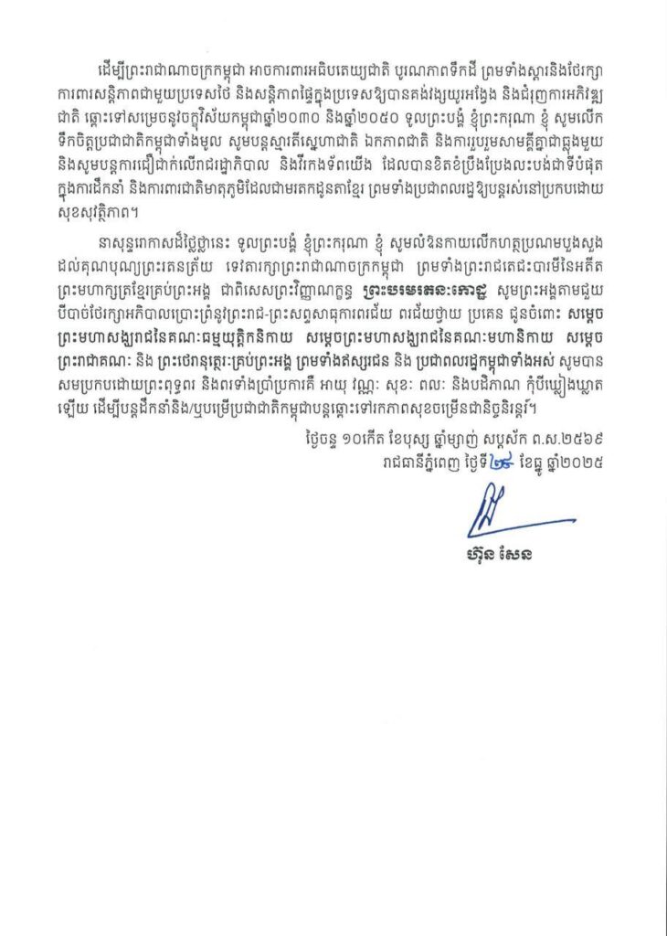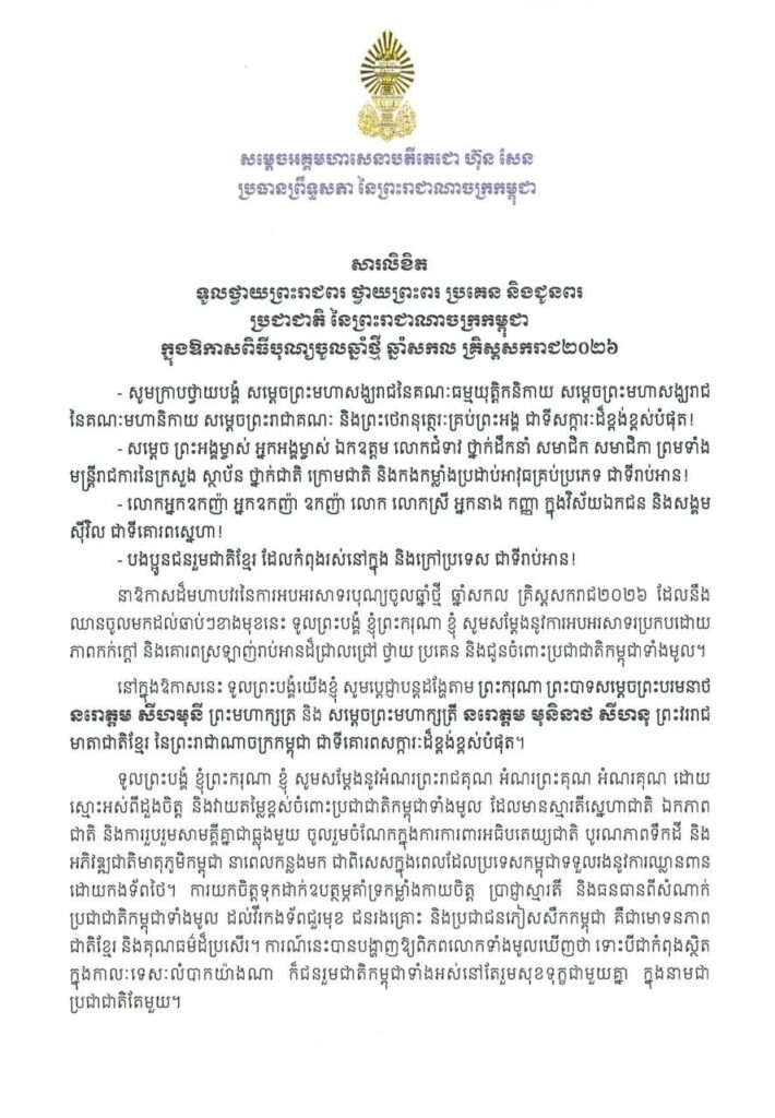 យោងតាមសារលិខិតទូលថ្វាយព្រះរាជពរ ថ្វាយព្រះពរ ប្រគេន និងជូនពរប្រជាជាតិ ក្នុងឱកាសពិធីបុណ្យចូលឆ្នាំថ្មី ឆ្នាំ២០២៦ សម្តេចអគ្គមហាសេនាបតីតេជោ ហ៊ុន សែន ប្រធានព្រឹទ្ធសភា នៃព្រះរាជាណាចក្រកម្ពុជា បានមានប្រសាសន៍ថា ការយកចិត្តទុកដាក់ឧបត្ថម្ភគាំទ្រទំាងកម្លាំងកាយចិត្ត ប្រាជ្ញាស្មារតី និងធនធានពីសំណាក់ប្រជាជាតិកម្ពុជាទាំងមូល ដល់វីរកងទ័ពជួរមុខ ជនរងគ្រោះ និងប្រជាជនភៀសសឹកកម្ពុជា គឺជាមោទនភាពជាតិខ្មែរ និងគុណធម៌ដ៏ប្រសើរ ។ ការណ៍នេះ បានបង្ហាញឱ្យពិភពលោកទាំងមូលឃើញថា ទោះបីជាកំពុងស្ថិត ក្នុងកាលៈទេសៈលំបាកយ៉ាងណា ក៏ជនរួមជាតិកម្ពុជាទាំងអស់ នៅតែរួមសុខទុក្ខជាមួយគ្នា ក្នុងនាមជាប្រជាជាតិតែមួយ។