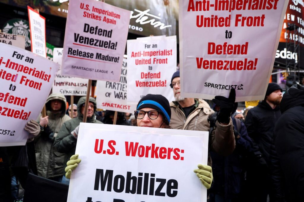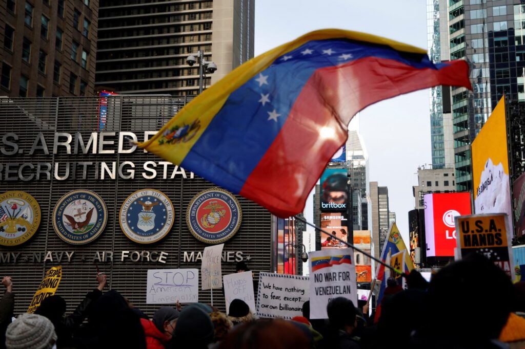 ក្រុមអ្នកតវ៉ារាប់រយនាក់បានប្រមូលផ្តុំគ្នានៅ Federal Plaza ក្នុងទីក្រុងឈីកាហ្គោ នៅយប់ថ្ងៃសៅរ៍ ដោយហៅប្រតិបត្តិការផ្តួលរលំរបបមេដឹកនាំវេណេស៊ុយអេឡា លោក ម៉ាឌូរ៉ូ ថា ជាទង្វើនៃចក្រពត្តិនិយម ដែលជនជាតិអាមេរិកមិនគាំទ្រ ហើយធ្វើឡើងដោយគ្មានការយល់ព្រមពីសភា ។