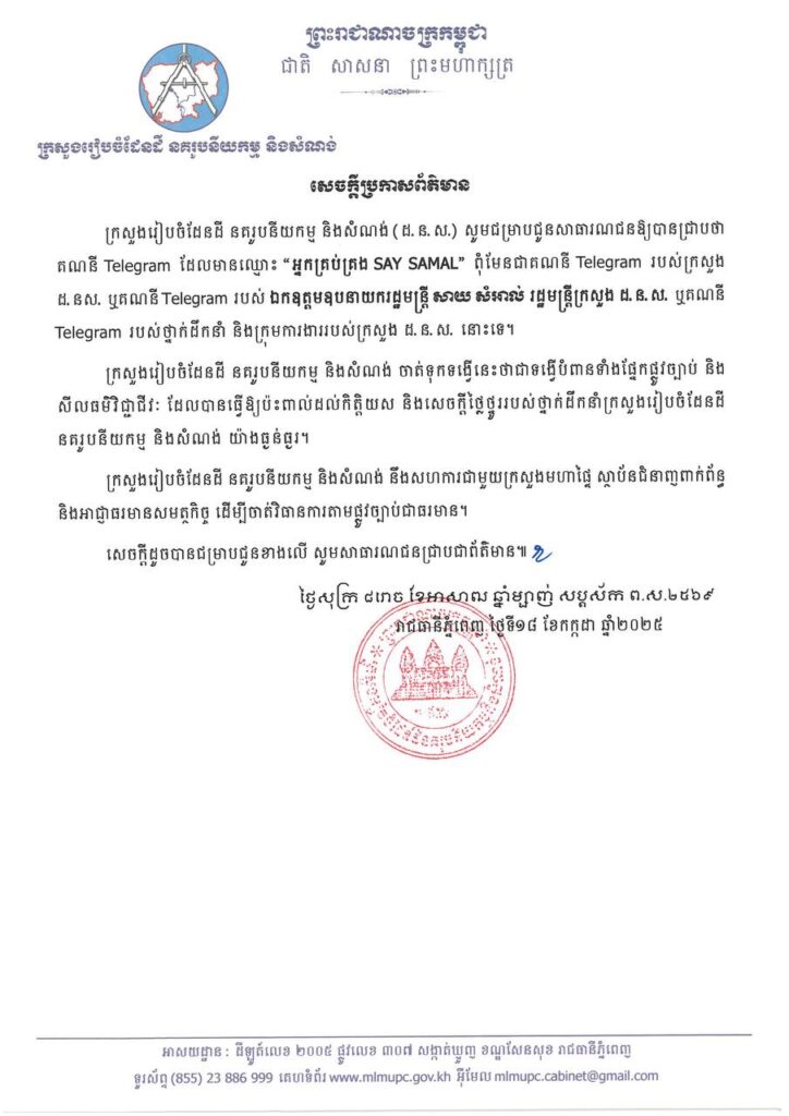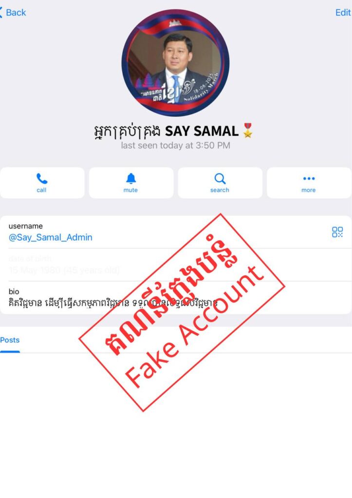 សូមជម្រាបជូនសាធារណជនឱ្យបានជ្រាបថា គណនី Telegram ដែលមានឈ្មោះ “អ្នកគ្រប់គ្រង SAY SAMAL”
