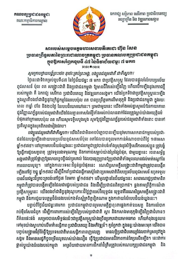 សារបានអំពាវនាវដល់បងប្អូនជនរួមជាតិទាំងអស់នៅគ្រប់ទិសទីសូមបន្តរួបរួមសាមគ្គីគ្នាជាធ្លុងមួយក្រោមបាវចនាជាតិ សាសនា ព្រះមហាក្សត្រ និងរួមសាមគ្គីជុំវិញរាជរដ្ឋាភិបាល ប្រកបដោយជំនឿមុតមាំចំពោះបុព្វហេតុដ៏យុត្តិធម៌របស់យើង។