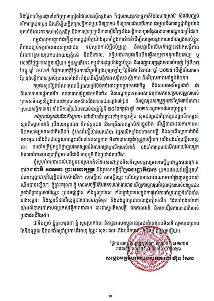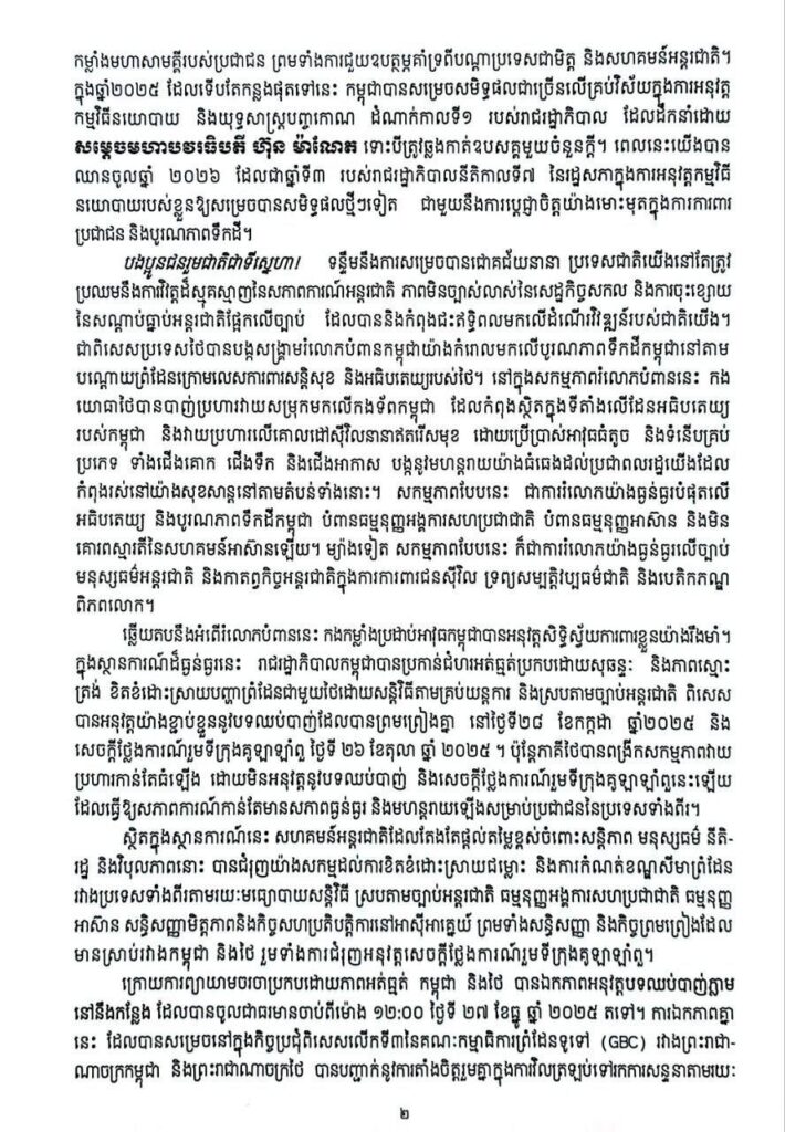 សម្ដេចតេជោ ហ៊ុន សែន បានសង្កត់ធ្ងន់ថាកម្ពុជាសូមបញ្ជាក់ជាថ្មីនូវការប្តេជ្ញាចិត្តយ៉ាងមុតមាំក្នុងការខិតខំដើម្បីសម្រេចនូវគោលដៅចម្បងរបស់ខ្លួនគឺការបញ្ចប់ទុក្ខវេទនារបស់ប្រជាជន ទប់ស្កាត់ការបំផ្លិចបំផ្លាញ និងបន្តដើរលើមាគ៌ាឆ្ពោះទៅរកសន្តិភាពដំណោះស្រាយប្រកបដោយយុត្តិធម៌ និងចីរកាល ទន្ទឹមនោះកម្ពុជានឹងមិនធ្វើសម្បទាននូវអធិបតេយ្យ ឬសេចក្ដីថ្លៃថ្នូររបស់ខ្លួនឡើយ។ ក្នុងស្មារតីនេះ កម្ពុជាអនុវត្តយ៉ាងខ្ជាប់ខ្ជួន និងពេញលេញនូវបទឈប់បាញ់ ថ្ងៃទី២៧ខែធ្នូ ឆ្នាំ ២០២៥ ក៏ដូចសេចក្តីថ្លែងការណ៍រួមទីក្រុងគូឡាឡាំពួ ថ្ងៃទី២៦ខែតុលាឆ្នាំ២០២៥ដើម្បីនាំយកមកវិញនូវសន្តិភាពសម្រាប់ប្រទេសទាំងពីរ ក៏ដូចដើម្បីសន្តិភាព សន្តិសុខ ស្ថិរភាព និងវិបុលភាពនៅក្នុងតំបន់។